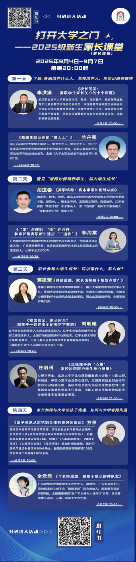 9月4日至7日每晚20:00起,为家长朋友们量身打造了一系列主题课程,涵盖高职教育发展、亲子沟通、心理健康等热门关切话题。通过《校长问答:高职学生家长最关心的十个问题》《高职生就业也能“高大上”》《家校协同,呵护学生身心健康》《亲子关系从对抗到合作的美好瞬间》等专题讲座,助力家长了解大学育人理念、掌握沟通方法,成为孩子成长路上坚实的支持者。