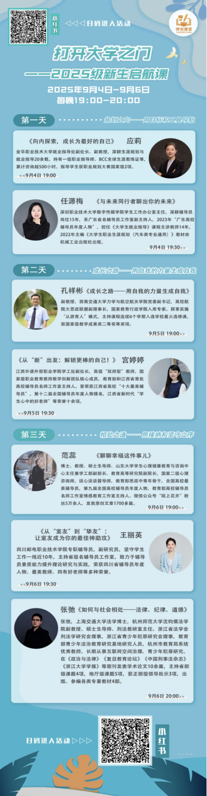 9月4日至6日每晚19:00起,来自多所高校的资深导师和知名学者将齐聚线上,围绕生涯规划、心理成长、法律认知等大学阶段关键主题,为2025级新生带来系列启航课程。包括《向内探索,成长为最好的自己》《成长之路——用自我的力量生成自我》《聊聊幸福这件事儿》《如何与社会相处:法律、纪律与道德》等多场精彩讲座,旨在帮助同学们明晰方向、建立信心、更好地适应大学生活。
