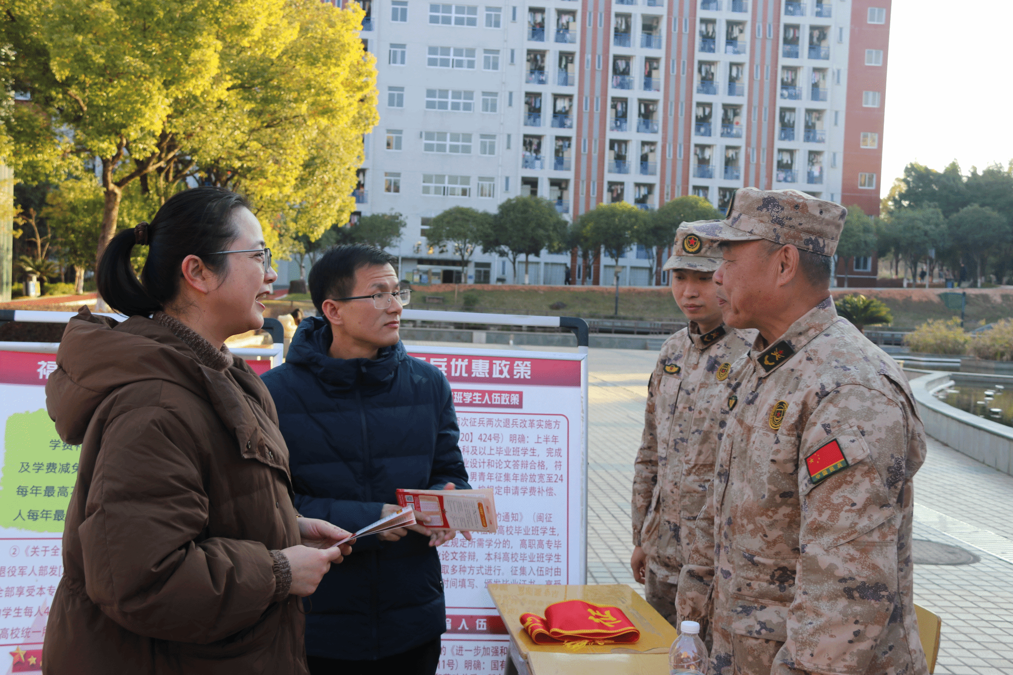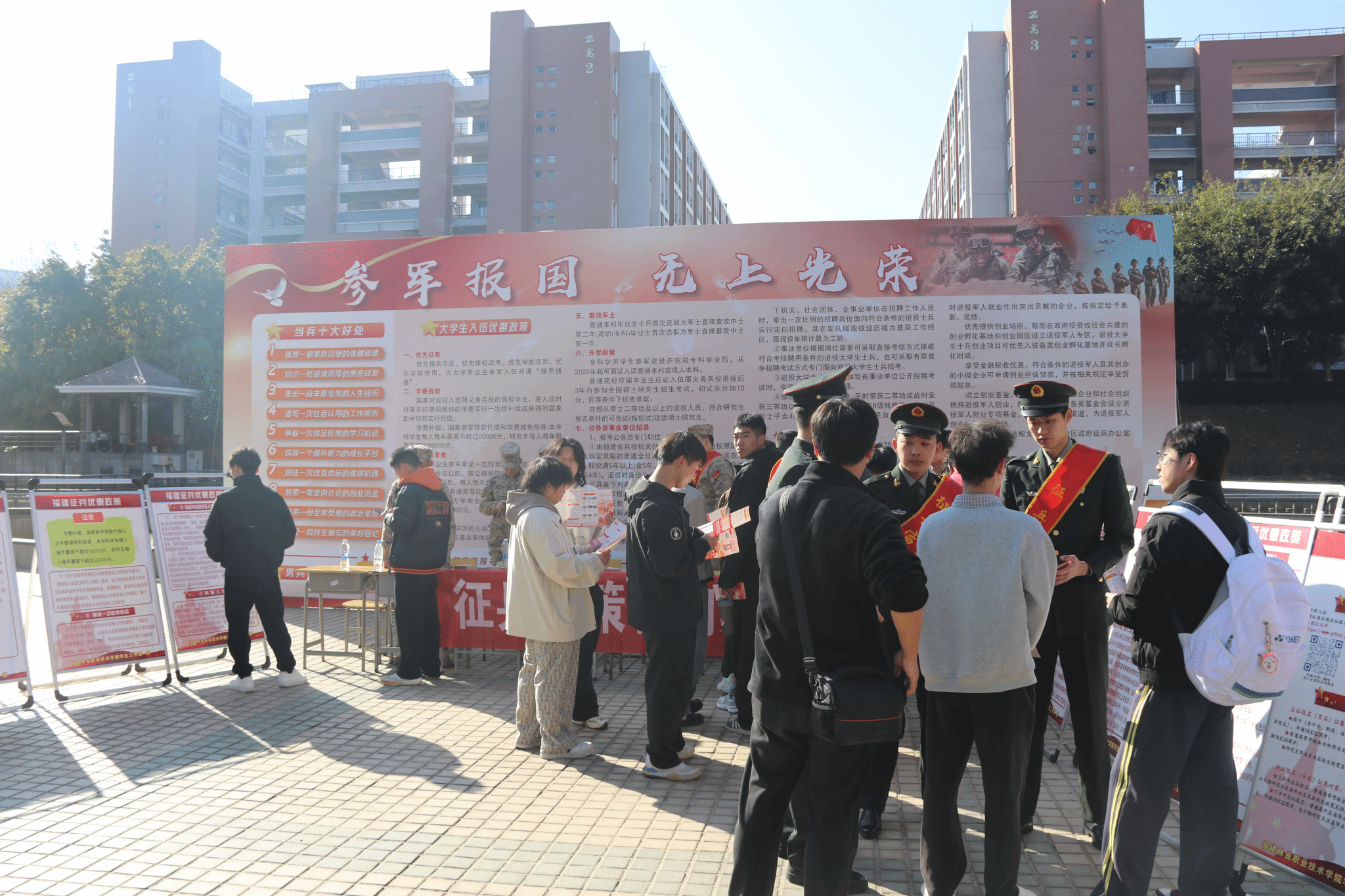 活动现场创新构建“政策宣讲+就业指导+榜样示范”三维宣传体系,让征兵宣传更具针对性和吸引力。延平区征兵办工作人员与学校党员干部组成专项工作组,在人工湖广场设立“征兵政策咨询处”,将2026年征兵政策与毕业生就业需求精准对接,重点解读“参军即成长、退役即赋能”的全周期保障机制,让毕业生清晰看到参军对职业发展的长远助力。