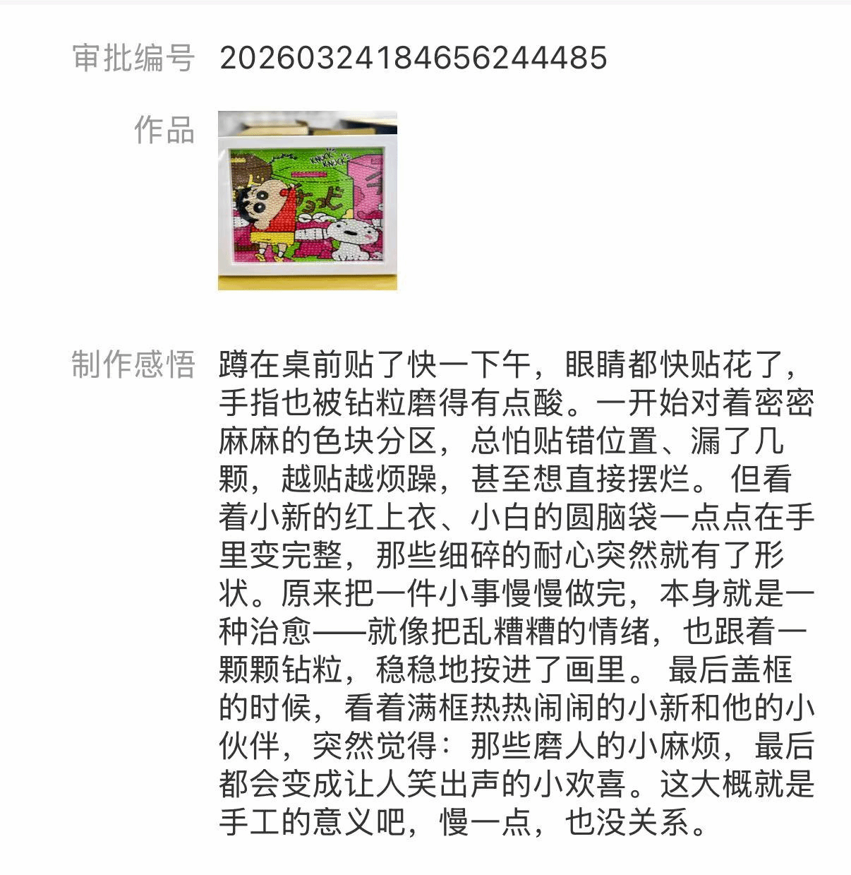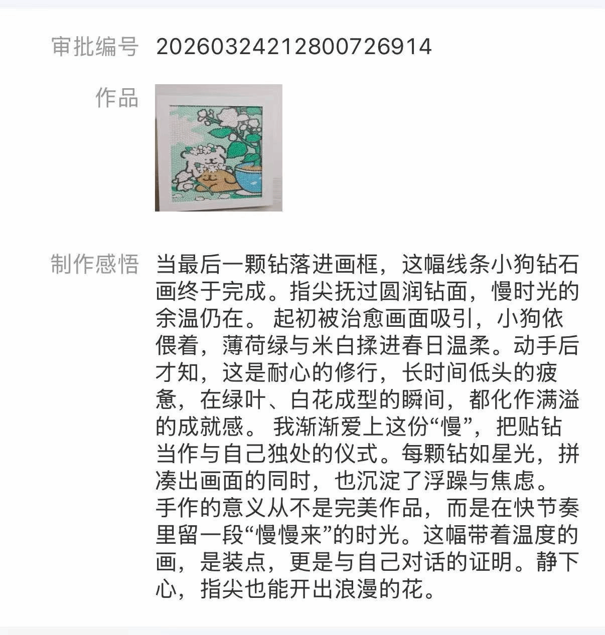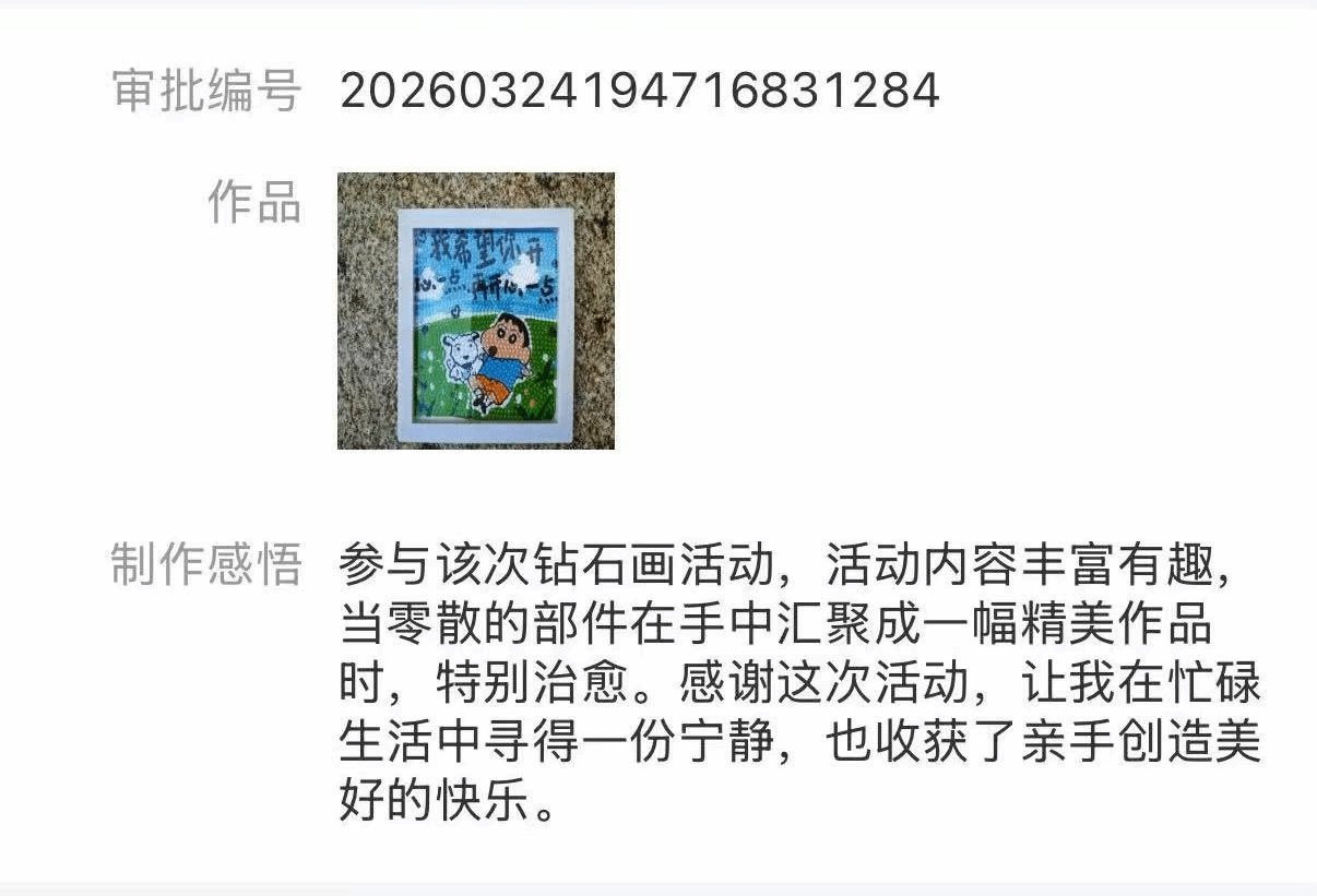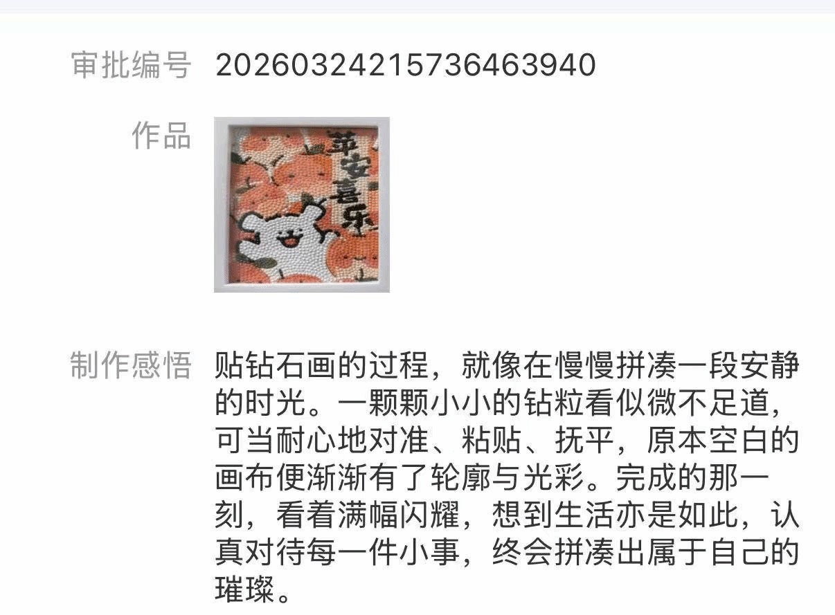 为丰富校园文化生活、涵养审美情趣、缓解学习压力,2026年3月24日-28日在江南校区举办“钻绘美好,手作芳华”贴画放松体验坊活动,本次活动由学生工作部主办,易班工作站承办,活动采用线上线下相结合的方式,吸引了235名学生参与,大家纷纷在易班APP打卡分享创作成果。