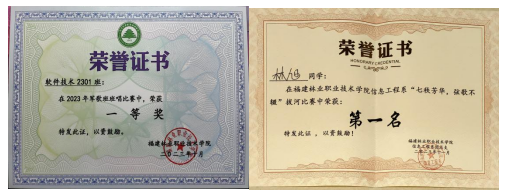入校以来先后获得:2024年10月福建林业职业技术学院军训期间“优秀教官”称号;2025年3月福建林业职业技术学院林学系“应急在心中短视频”主题比赛一等奖;2025年5月南平市第二届大学生消防趣味运动会团体二等奖、优胜队伍三等奖;2025年5月福建林业职业技术学院院级“博爱寻踪、生命定向”定向越野比赛二等奖;2025年5月福建林业职业技术学院林学系“爱我国防”大学生演讲比赛一等奖;2025年5月福建林业职业技术学院第二届大学生军事技能比武战术基础动作三等奖;2025年6月福建林业职业技术学院院级“爱我国防”大学生演讲比赛二等奖;2025年6月马克思主义学院2025年“我心中的思政课”高校大学生微电影三等奖;2025年6月福建林业职业技术学院学生社团工作积极分子;2025年6月福建林业职业技术学院国旗护卫队“优秀队员”;2025年9月福建林业职业技术学院一等奖学金;2025年9月福建林业职业技术学院国家励志奖学金;2025年9月福建林业职业技术学院三好学生;2025年9月福建林业职业技术学院优秀学生干部;2025年10月福建林业职业技术学院军训期间“优秀教官”称号;2025年11月福建省大学生军事技能比武团体一等奖;2025年12月福建省青少年无线电测向锦标赛大学组3.5MHz短距离测向团体一等奖;2025年12月福建省青少年无线电测向锦标赛大学组3.5MHz中距离测向团体二等奖;2025年12月福建省青少年无线电测向锦标赛大学组144MHz中距离测向团体三等奖;2025年12月福建省青少年无线电测向锦标赛大学组3.5MHz短距离测向男子组亚军等奖项。