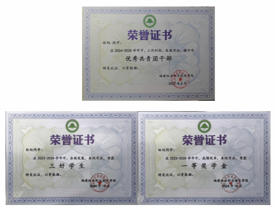 全面发展的综合表现,让林旭在2024-2025学年获评福建林业职业技术学院“最美学生”荣誉称号,这是对他学业、工作、志愿、品德等多方面的高度认可。从军营硬汉到校园榜样,从学生干部到志愿先锋,他用两年时光书写了“全方位成长”的青春答卷。谈及未来,林旭有着清晰的规划:继续深耕软件技术专业,通过专业认证提升核心技能;传承军旅精神与志愿服务热忱,带动身边同学共同进步;在实践中积累更多经验,为集体发展贡献更大力量。