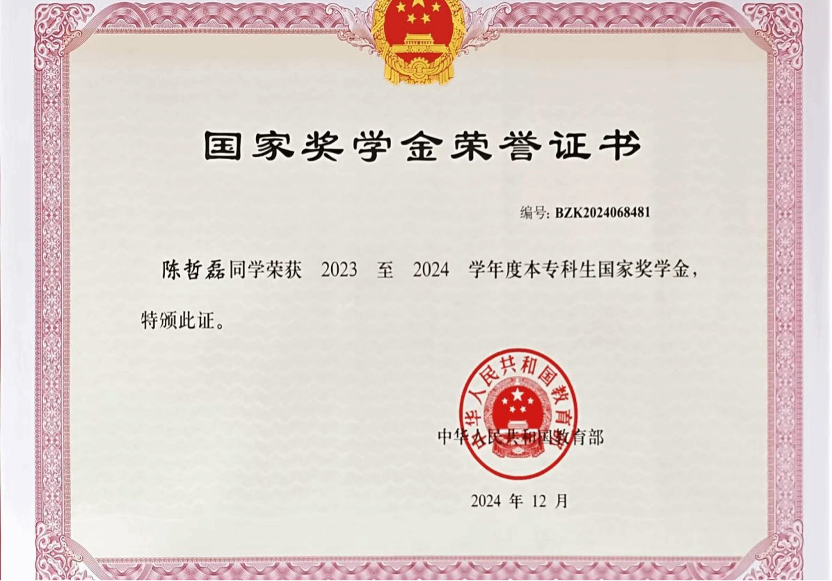 凭借坚韧毅力与勤奋精神,他成绩稳居班级前列,斩获2024-2025学年、2023-2024学年国家奖学金,2023-2024学年、2024-2025学年学院一等奖学金,还荣获“青春榜样”“三好学生”“优秀共青团员”“优秀教官”等多项荣誉。这些荣誉是对他过往努力的肯定,更是激励他在知识海洋中乘风破浪、持续深耕的动力。