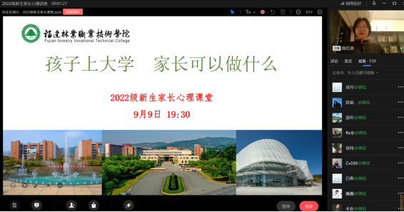 2022年9月9日晚19:30福建林业职业技术学院心理辅导教师陈红英为新生家长带来“孩子上大学 家长可以做什么”心理讲座,新生家长同时段观看了此次讲座。