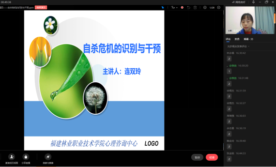 为进一步宣传和普及心理健康知识,传播心理健康理念,提高心理委员专业胜任力,学生工作部心理老师连双玲于2023年4月4日开展线上心理委员专题培训讲座——自杀危机的识别与干预,2021级全体心理委员参加。