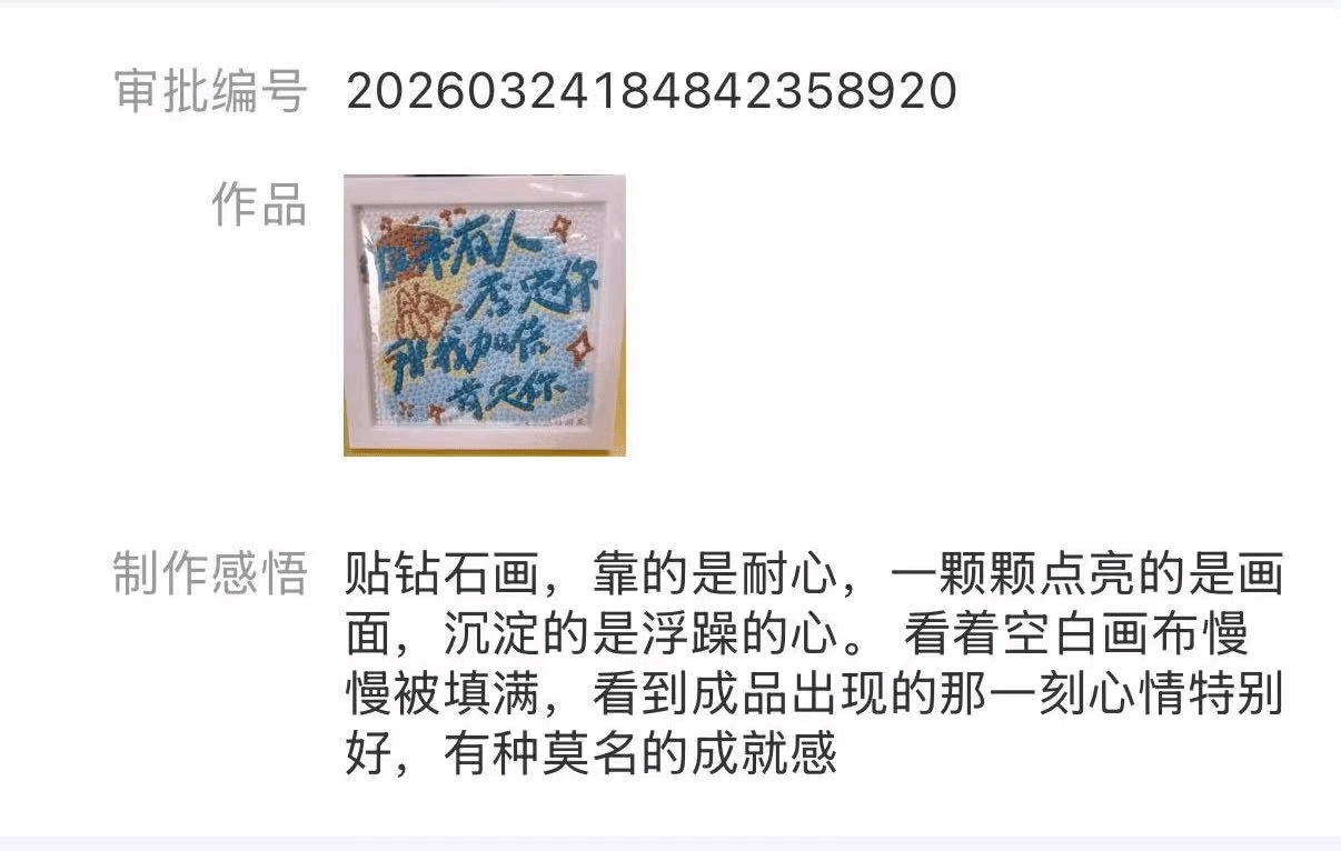 为丰富校园文化生活、涵养审美情趣、缓解学习压力,2026年3月24日-28日在江南校区举办“钻绘美好,手作芳华”贴画放松体验坊活动,本次活动由学生工作部主办,易班工作站承办,活动采用线上线下相结合的方式,吸引了235名学生参与,大家纷纷在易班APP打卡分享创作成果。