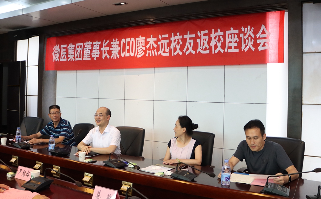本网讯 7月10日下午,我校采运8823班杰出校友,微医集团董事长兼CEO廖杰远一行重返母校参观考察。院党委书记万泉、院长刘文开、院党委副书记严绍裕、党政办公室主任廖世建、经济管理系主任蔡敏等领导陪同校友参观校园,并与校友们进行了亲切座谈。