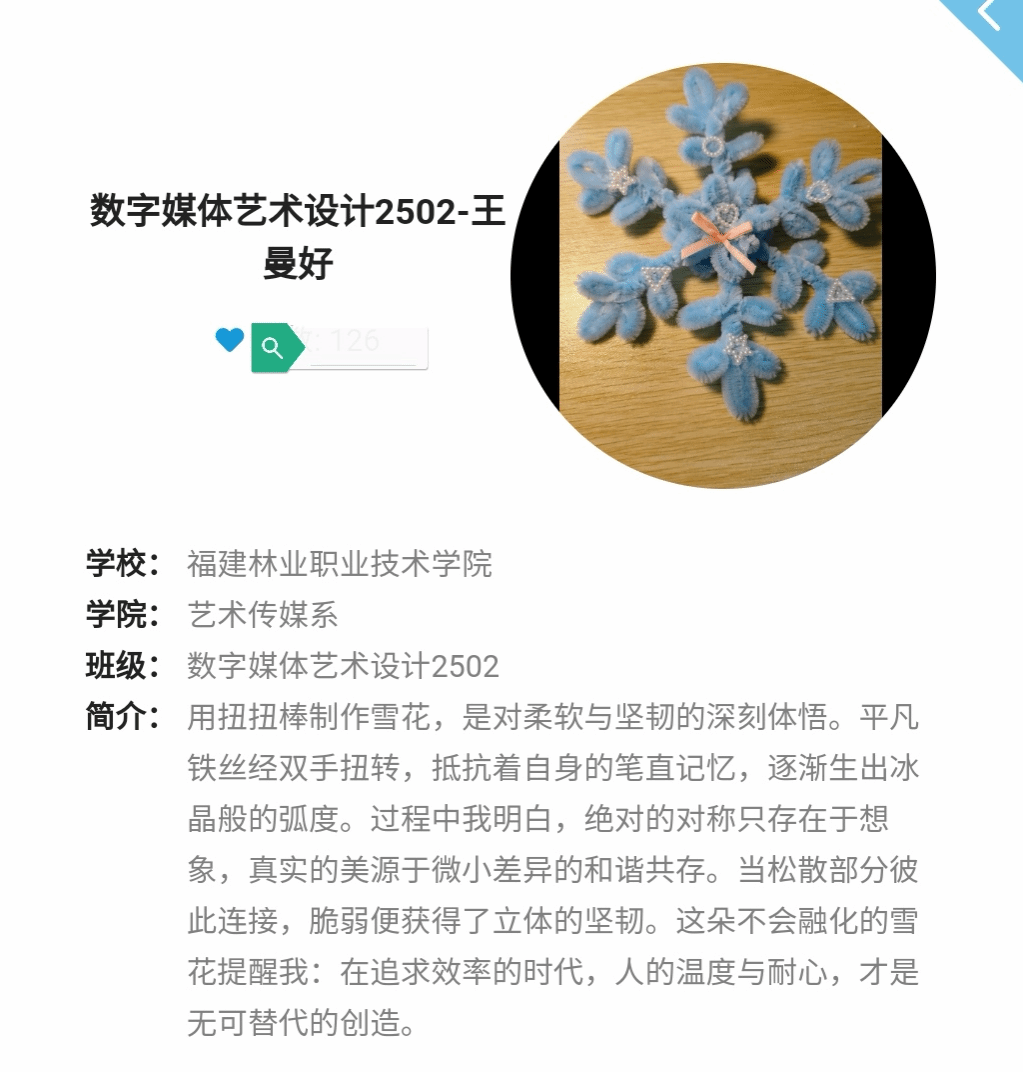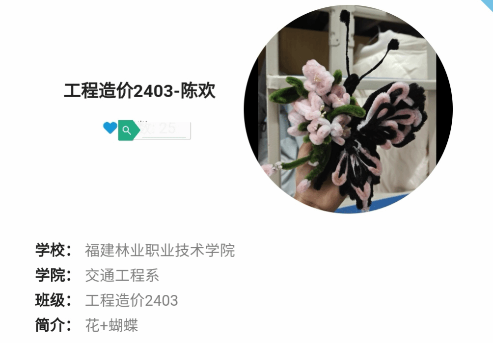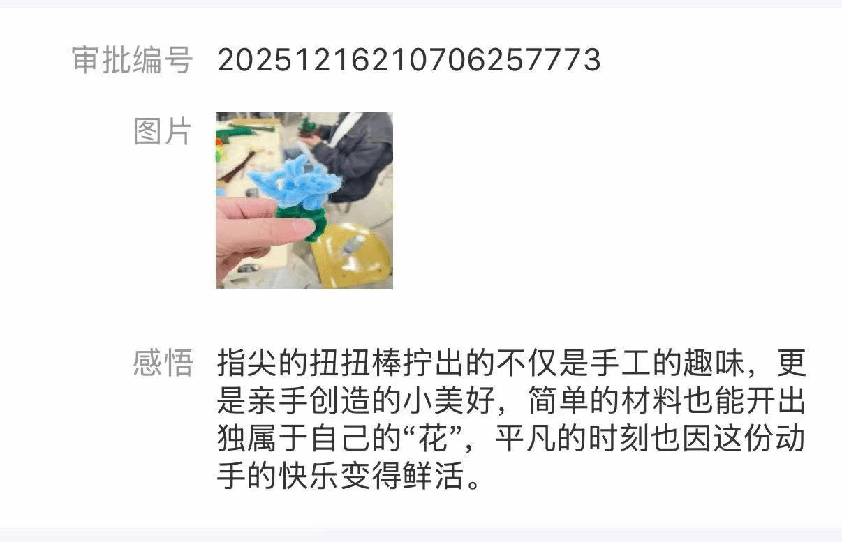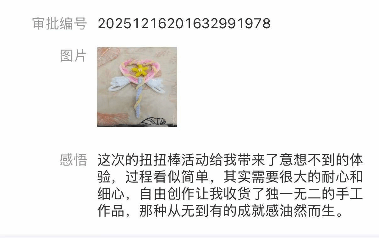 为丰富校园文化生活,释放创意活力,缓解学习压力,福建林业职业技术学院学生工作部特推出“扭扭棒手工DIY活动”。活动于2025年12月16日-20日在江南校区教学楼开展,面向全院学生开放,无论你是手工达人还是创意新手,都能在这里找到属于自己的乐趣。本次活动采用线上线下相结合的方式,全院328位学生积极参与,在易班APP上踊跃打卡。