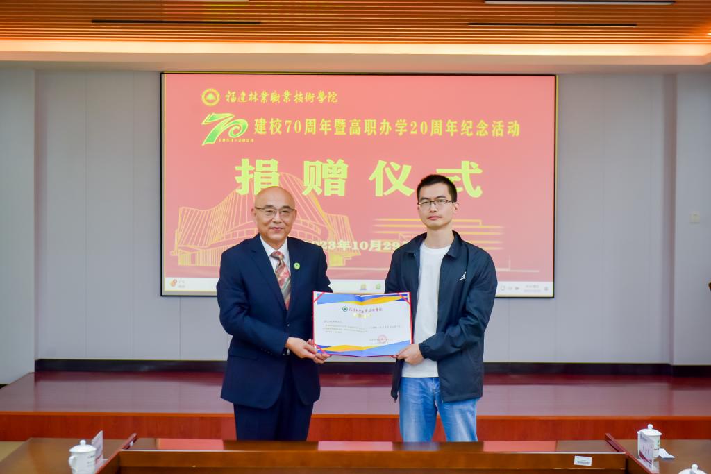 本网讯 饮水思源不忘初心,真情回馈携手同行。10月29日,在喜迎福建林业职业技术学院建校70周年暨高职办学20周年华诞之际,学院在江南校区行政楼6楼会议室举行校友企业捐赠仪式。