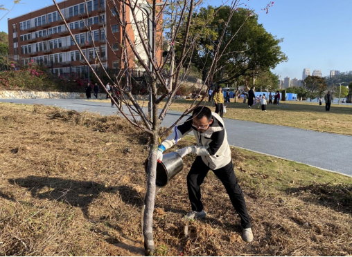 阳春三月,春光明媚,泗华溪畔岸青水绿,鸟语花香,处处洋溢着生机与希望。只见40棵福建山樱花与8棵风铃木排成整齐的队列,静静地等候着校友们来除草施肥。