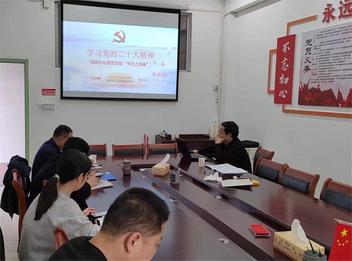 2022年11月15日,党政办公室党支部组织全体党员开展专题党课学习。党支部书记廖世建以《学习党的二十大精神》为题,阐释党的二十大报告提出的重要观点、重要论断、重要思想。