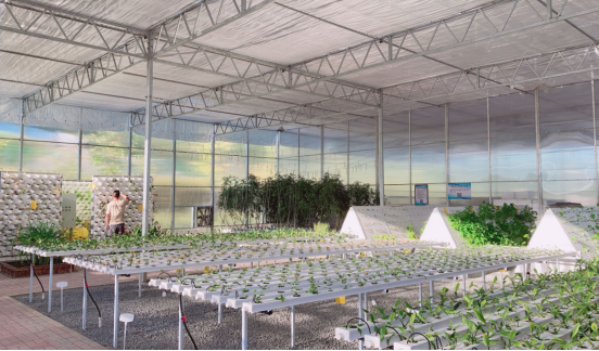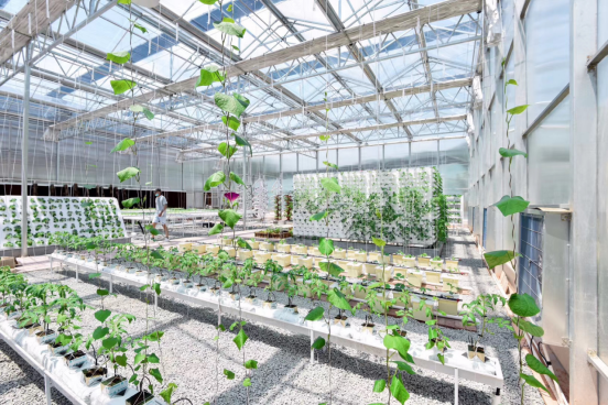 无土栽培实训室位于园林综合实训基地,面积约660 m²,有营养液膜、深液流、气雾培、基质培等多种无土栽培模式,集教学、生产、科研为一体,可供100多人开展实训操作。主要有营养液膜栽培(NFT)设备:重力循环栽培机、平铺式水培架、A字型水培架、双螺旋管道柱等;深液流栽培(DFT)设备:碟片栽培柱、立体蔬菜墙;气雾培设备;基质培设备:荷兰桶、椰糠条、一米菜园等。所有设备均由水肥一体化机控制,自动补充营养液。