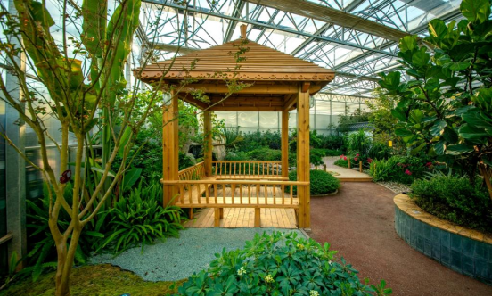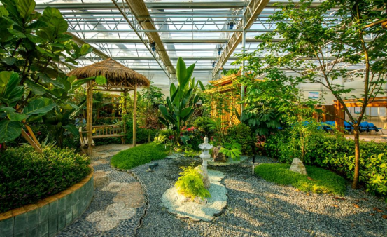 园林景观实景馆位于园林综合实训基地,该实训室结合园林类专业特色,主要分为景观展示区和实训操作区两部分,面积约660m²,可供100多人实训操作。整体以混合式园林布局为主,将各种典型园林景观风格、元素进行合理布局,营造各类小空间,例如日式枯山水、江南园林特色景墙、花架、亭、假山流水、铺装等。部分结构采用用钢化玻璃替代铺装,可透过钢化玻璃直观感受园林工程的断面结构和做法。