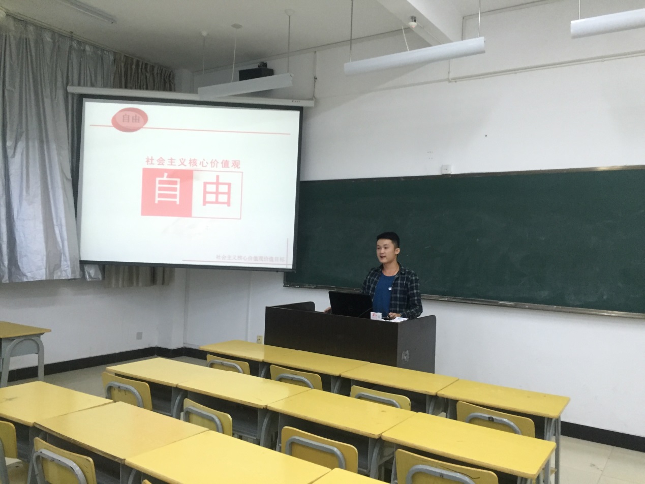 陈炳存同学以自由为主题,向我们阐述了社会主义核心价值观中自由的表现。首先,陈炳存同学提出了一个思考问题:每个人心中认识的自由和通过这节课了解的自由有什么区别和共同点。陈炳存同学从中国传统文化中对自由的追求、自由的含义、如何理解社会主义核心价值观中的自由、怎样培育和弘扬社会主义核心价值观中的自由以及自由与责任的关系五个方面给我们全面介绍了社会主义核心价值观的自由。陈炳存同学指出,自由作为一种人生价值和社会理想,是全人类从古至今都为之奋斗、拼搏的精神。如今,更是被贴上了“社会主义核心价值观的本质要求”的重要标签,足以证明自由对个人、对社会、对国家、对世界的意义。最后,针对提出的问题,陈炳存同学针对个人自由和社会主义核心价值观中的自由作出了总结,现阶段强调自由,是以理性与规则为前提的自由,也是以自律为基础的自由。人民的自由,是中国共产党凝聚民心民力、汇聚民智民策的精神纽带,因此,它必然是社会主义核心价值观不可或缺的要素。