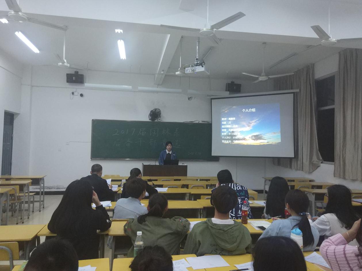 2018年3月28日晚上七点与29日中午十二点十分,园林系团总支于实训四612教室举行了新一届园林系两委会后备干部竞选。参加此次竞选的是现任两委会各部门干事,由陈剑勇书记、孙钰老师、两委会主席团以及各部门负责人组成评审团。