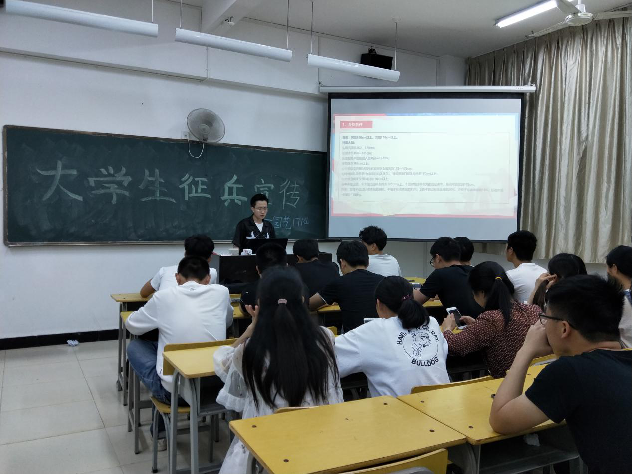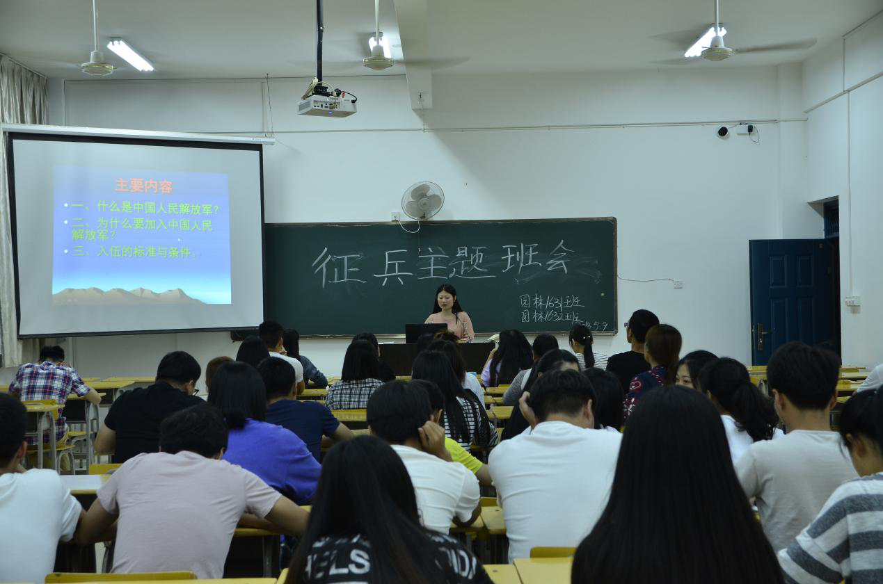 为了响应中央的大学生征兵工作,同时提高同学们征兵入伍的积极性,2018年5月9日晚上19点整,园林系学习部在实训四5楼教室举办了“征兵入伍宣传”主题班会活动。