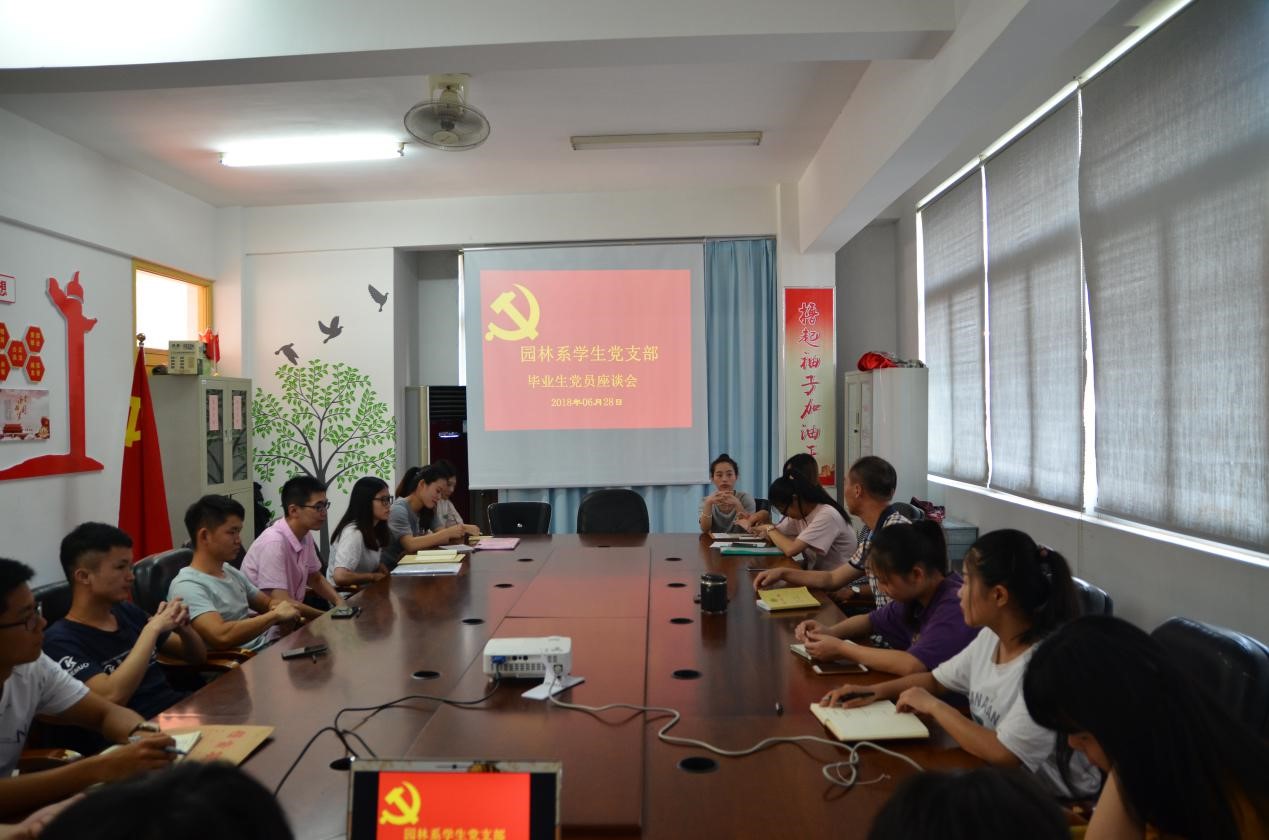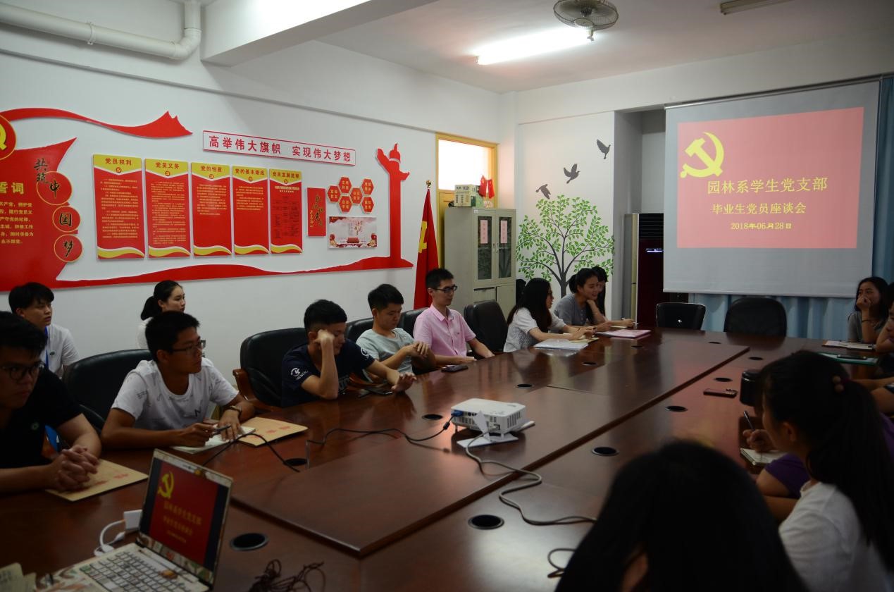 2018年6月28日下午两点三十分,园林系学生党支部毕业生党员座谈会于园林系学生党支部会议室召开,园林系毕业班学生党员、预备党员以及积极分子参加了此次会议,主持座谈会的是我系学生党支部书记陈剑勇老师。