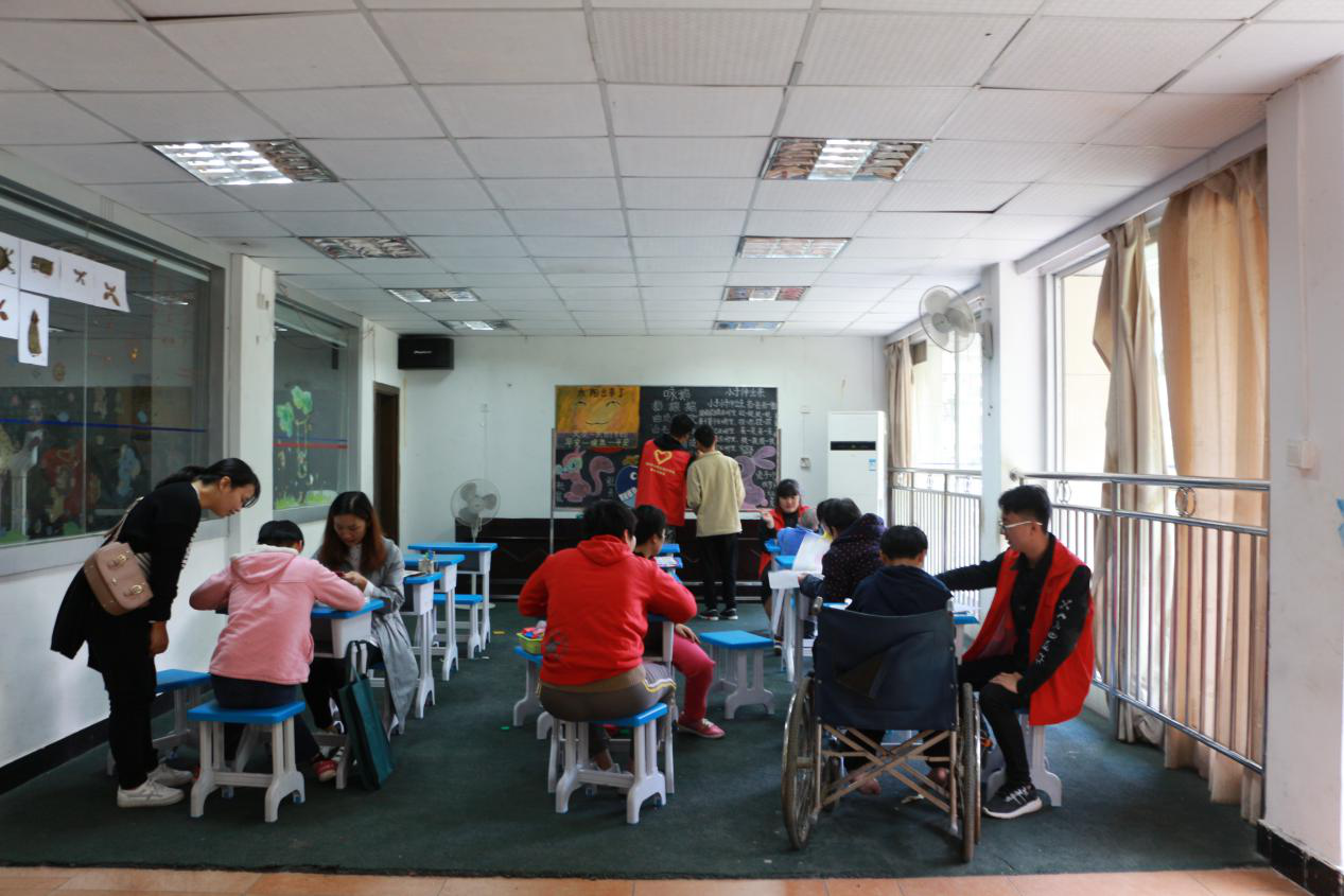 志愿者们在工作人员的带领下,照看孩子们,陪着孩子们聊天,游戏,教他们画画、拼音、识字、念诗,与孩子们欢乐嬉戏,气氛温馨融洽,孩子们的笑声充满了整个院里。下午16:30志愿者告别了孩子们。