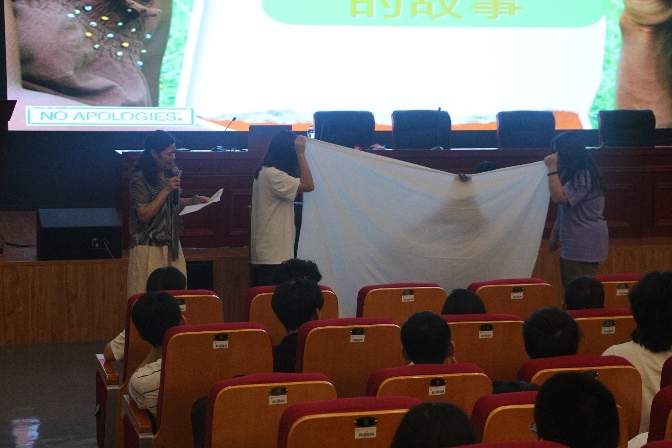 随后茅木花老师用数据说话,她向同学们展示了大学生性行为及大学生对恋爱的想法的调查数据,数据显示中国的性观念开放,性知识却没跟上。茅木花老师还邀请同学们上台表演情景剧,通过情景剧请明白在与异性交往中要设立界限才能获得真正的自由,才能让青春无悔。她教育同学们应要早知道并了解性知识,要通过正确的渠道获得性教育方面的知识,要有正确的恋爱观。