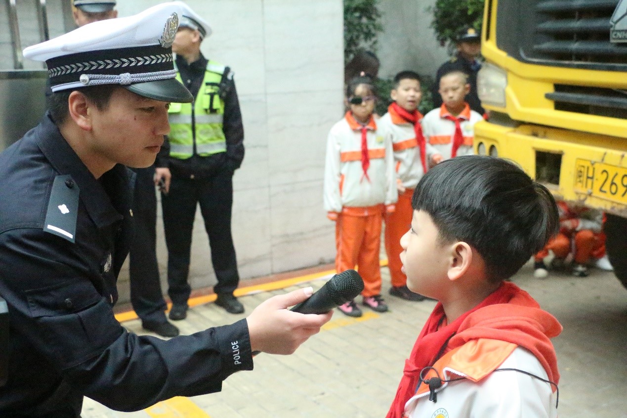 在活动开始前,志愿者们与校方及民警一起布置了交通安全主题教育活动的场景,民警们还特意借来了在市区少见的乍浦车用作道具。活动中,陈警官根据小学生年龄特点、认知特点,用生动形象的事例以及让小学生们在大货车司机的视野盲区亲身体验等模拟实验,用更易于小学生接受的方式培养其交通安全意识,增强他们的自我保护能力,并且结合交通事例,以生动有趣的语言和小学生们互动,向他们进行汽车、大货车司机视野盲区的详细讲解。在增强学生们的交通意识和自我保护能力的同时教育学生们自觉遵守交通法规。志愿者们在一旁也是受益良多。