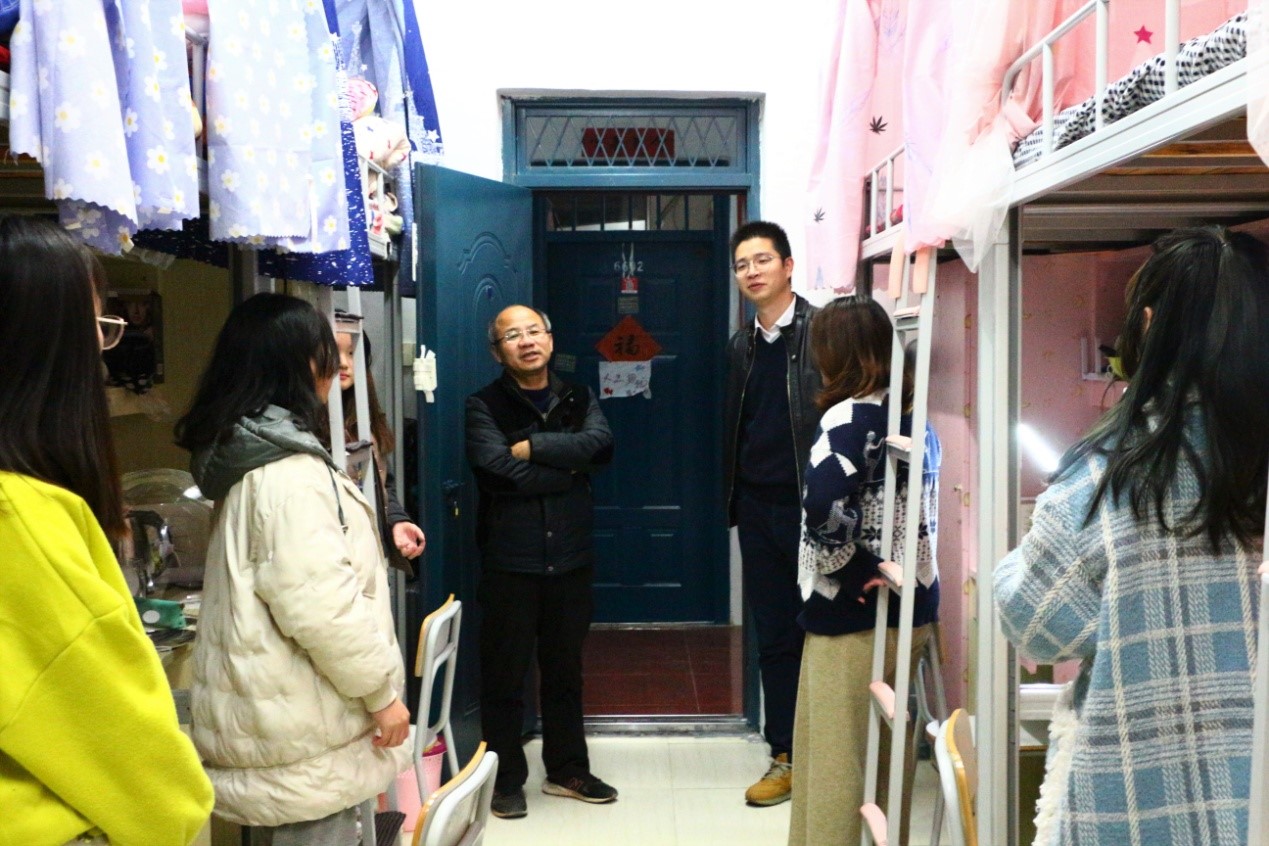 在学生宿舍,值此辞旧迎新之际,系领导向同学们表达了自己的喜悦与祝福。黄华明主任与吴旻科长与同学们亲切交流,了解他们的生活情况、期末考试复习情况和假期的安排。师生们还共同回忆起刚过去的一年里许多日常生活的趣事,欢快的笑声在宿舍回荡。
