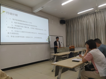 比赛分为职业规划阐述和问答两个环节。参赛选手结合PPT从自我认识、职业认识、职业生涯规划等方面进行阐述。评委根据选手的阐述进行提问。整个比赛过程紧张有序,选手们的演讲逻辑清晰、重点突出、结构完整,整个比赛演讲过程富有极强的感染力。