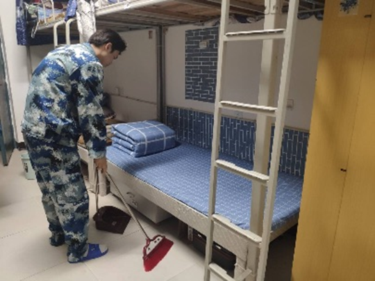 今天开始由各班军训教官对同学们进行蹲下、坐下、起立等基础动作训练,让同学们掌握各动作要领,之后便进行齐步、踏步、立定与跨立等动作训练,教官们细致认真地调整同学们的动作,使其更加规范和美观。但由于天气下雨,下午的训练取消,改为宿舍内务整理,同学们在教官规范的指导下,努力营造出良好的宿舍环境,将宿舍面貌焕然一新。