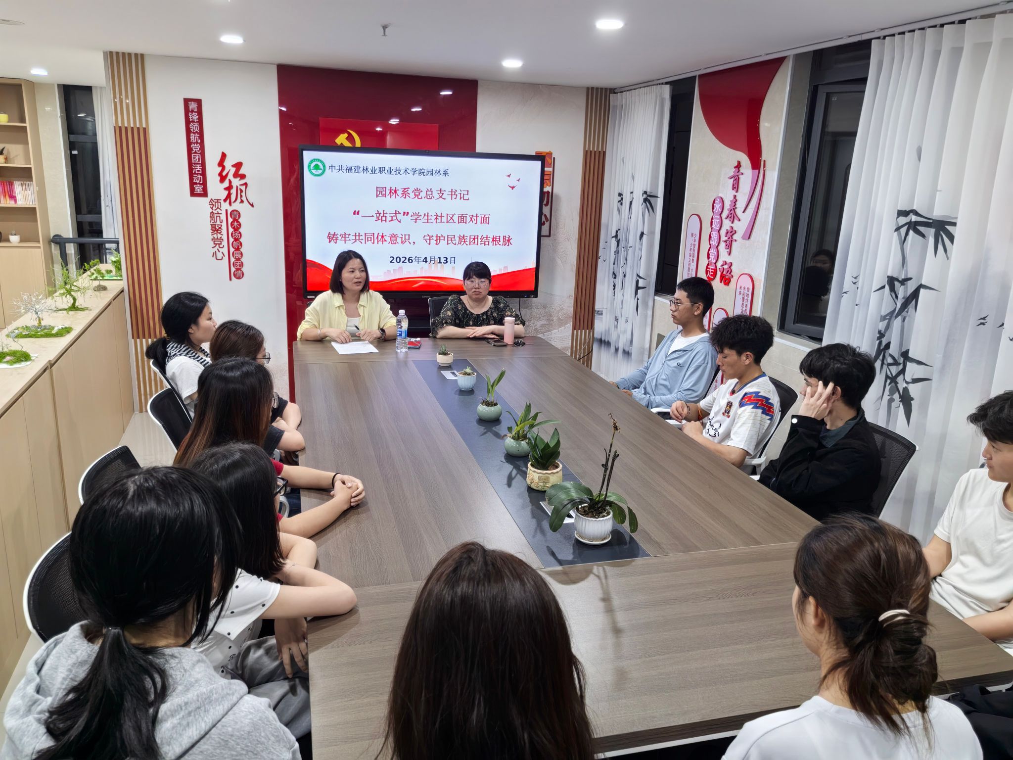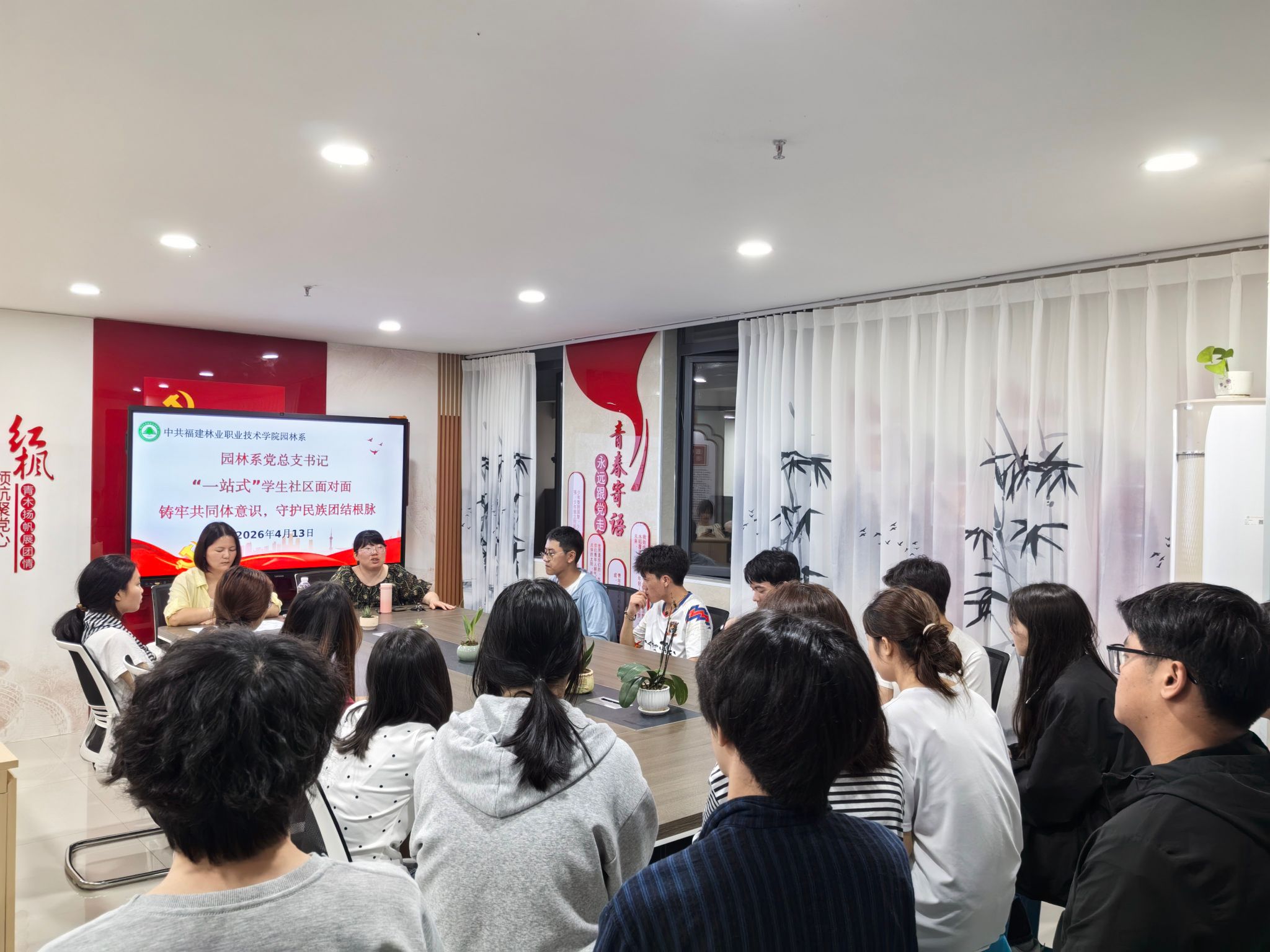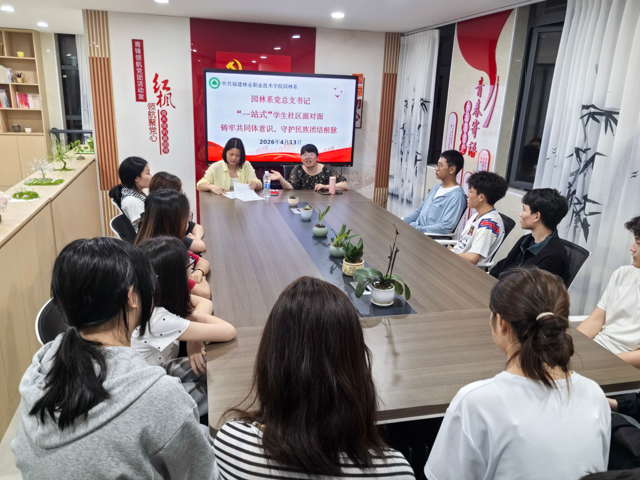 为深入推进民族团结进步教育走深走实,引导学生铸牢中华民族共同体意识,2026年4月13日,园林系在“一站式”学生社区开展“铸牢共同体意识,守护民族团结根脉”面对面交流活动。园林系党总支书记黄淑燕、学生科科长吴锦鸿、相关辅导员及少数民族学生代表围坐一堂,以心交心、共话成长。