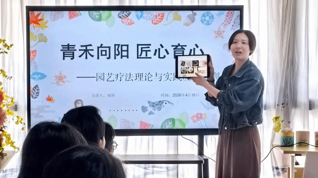 培训中,刘玥老师结合自身教学与研究经验,系统阐释了园艺疗法的定义、发展历程及“五感疗愈”核心原理,详解其在情绪调节、压力缓解等方面的功效,并结合典型案例,解析了园艺疗法与心理学、植物学的融合逻辑,以及针对不同人群的疗愈方案设计思路。