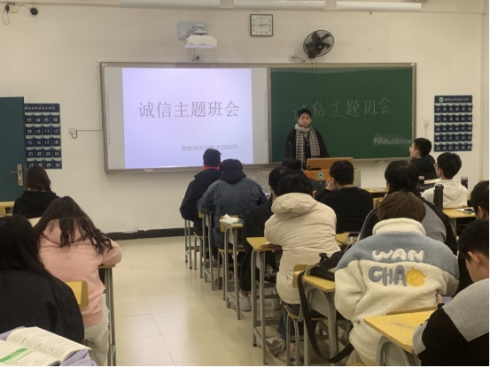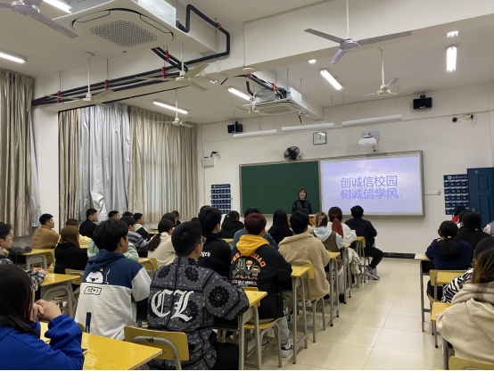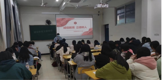 围绕“诚信”,各班在班会上引导同学们认识诚信的基本含义,分享古人讲诚信的故事、观看“诚信”相关视频,宣讲国家法律法规中的信用条款、学习学院规章制度、呼吁大学生在申请生源地助学贷款和国家助学金的过程中要诚实守信,养成良好品格。