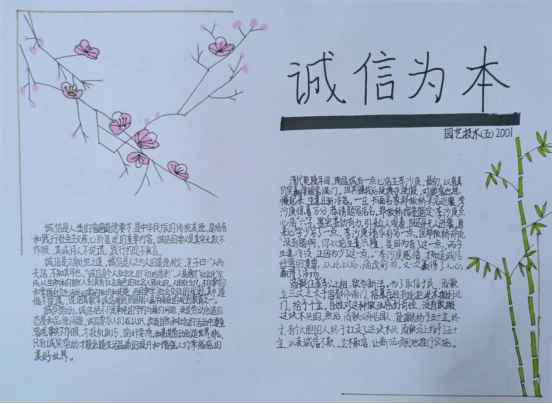 诚信是一种重要的品质,它是维持社会正常秩序和良好发展的基石。诚信不仅在个人生活中具有深远影响,也在人际交往和社会合作中扮演着不可或缺的角色。2023年11月,园林系开展以诚信教育活动,各班通过开展主题班会、诚信主题手抄报等形式进行,活动学习氛围浓厚。