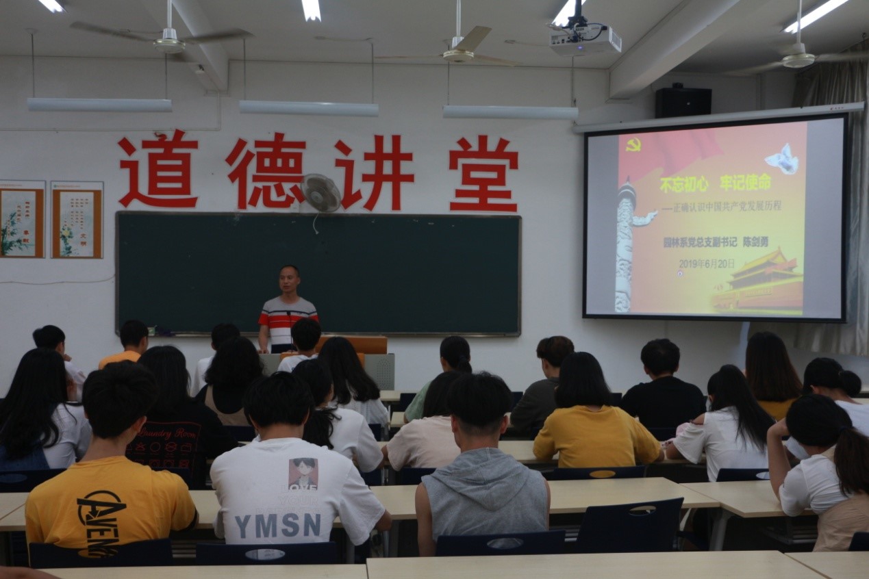 2019年6月20日下午17:40,园林系学生党支部于实训四210开展了《不忘初心 牢记使命——正确认识中国共产党发展历程》讲座。讲座由园林系党总支副书记陈剑勇主讲。园林系学生党支部全体党员和入党积极分子听取了讲座。