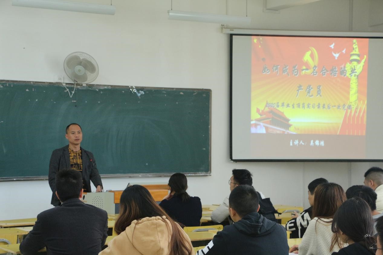 2019年11月29日中午,园林系学生党支部于实训四510开展《如何成为一名合格的共产党员》——2020届毕业生顶岗实习前最后一次党课。党课由党支部书记吴锦鸿老师主讲。园林系学生党支部全体教师党员、毕业生党员和入党积极分子参加本次党课。