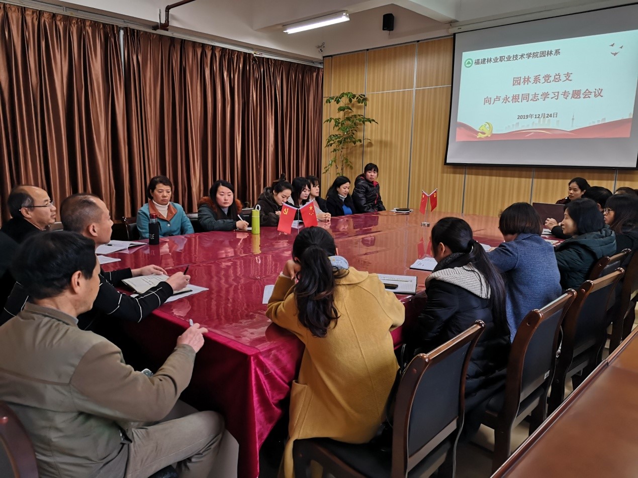 2019年12月24日下午,园林系党总支于实训一3楼系会议室召开向“时代楷模”卢永根同志学习专题会议。会议由园林系党总支副书记陈剑勇主持。园林系全体专兼职教师参加会议。