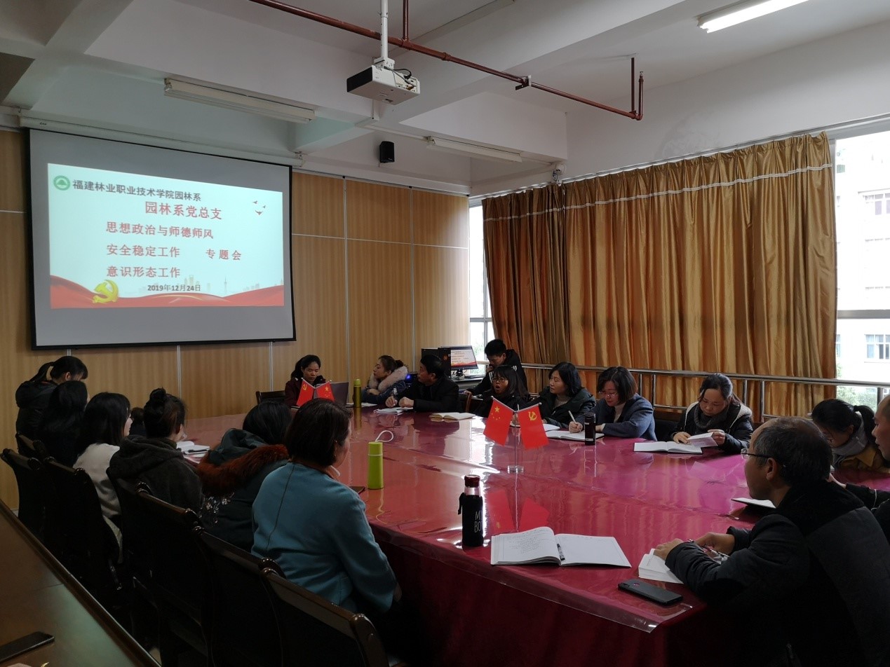 2019年12月24日下午,园林系党总支于实训一3楼系会议室召开思想政治与师德师风、安全稳定工作、意识形态工作专题会。会议由园林系党总支副书记陈剑勇主持。园林系全体专兼职教师参加会议。