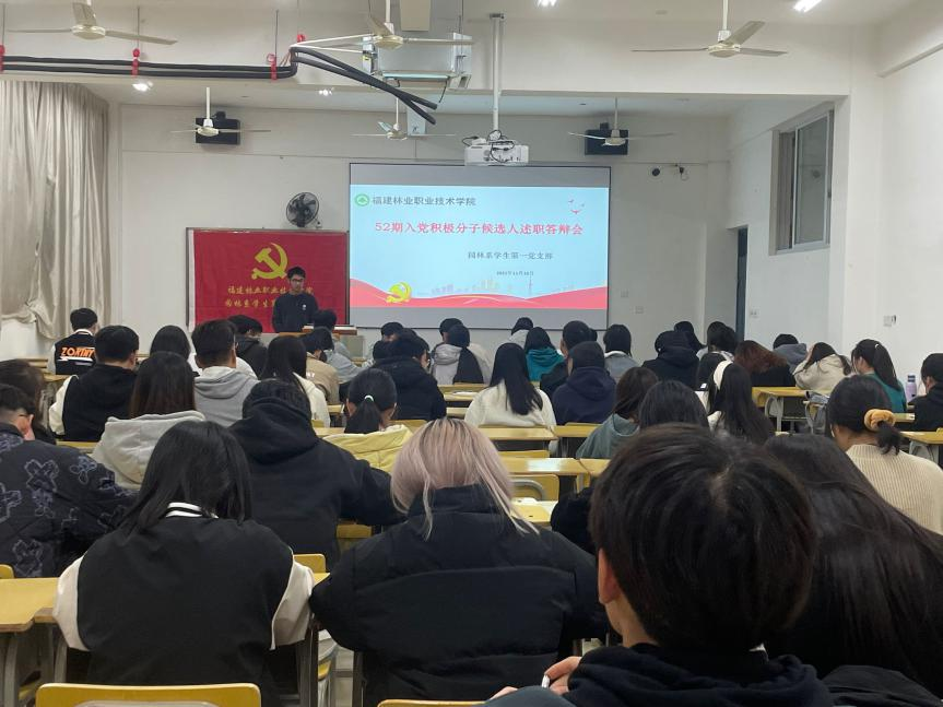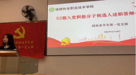 2021年11月10日晚上,园林系学生第一党支部于实训四407和409教室召开52期入党积极分子候选人述职答辩会。会议由园林系学生第一党支部成员、园林系专职组织员吴慧敏同志和园林系学生第一党支部书记孙钰同志主持,园林系学生第一党支部党员和入党积极分子代表、园林系学生第二党支部入党积极分子代表以及园林系学生第一党支部本期入党积极分子候选人参加本次会议。