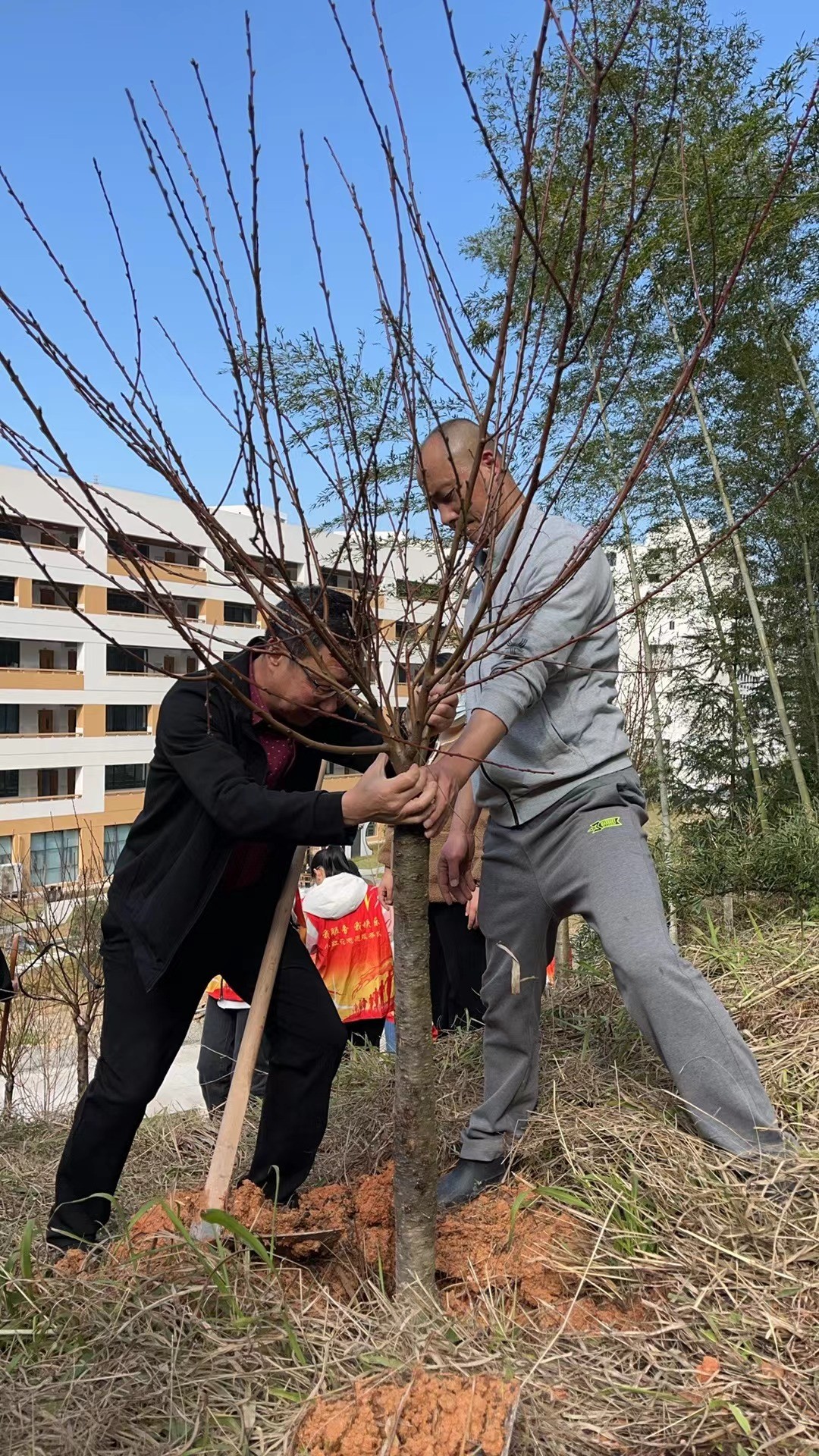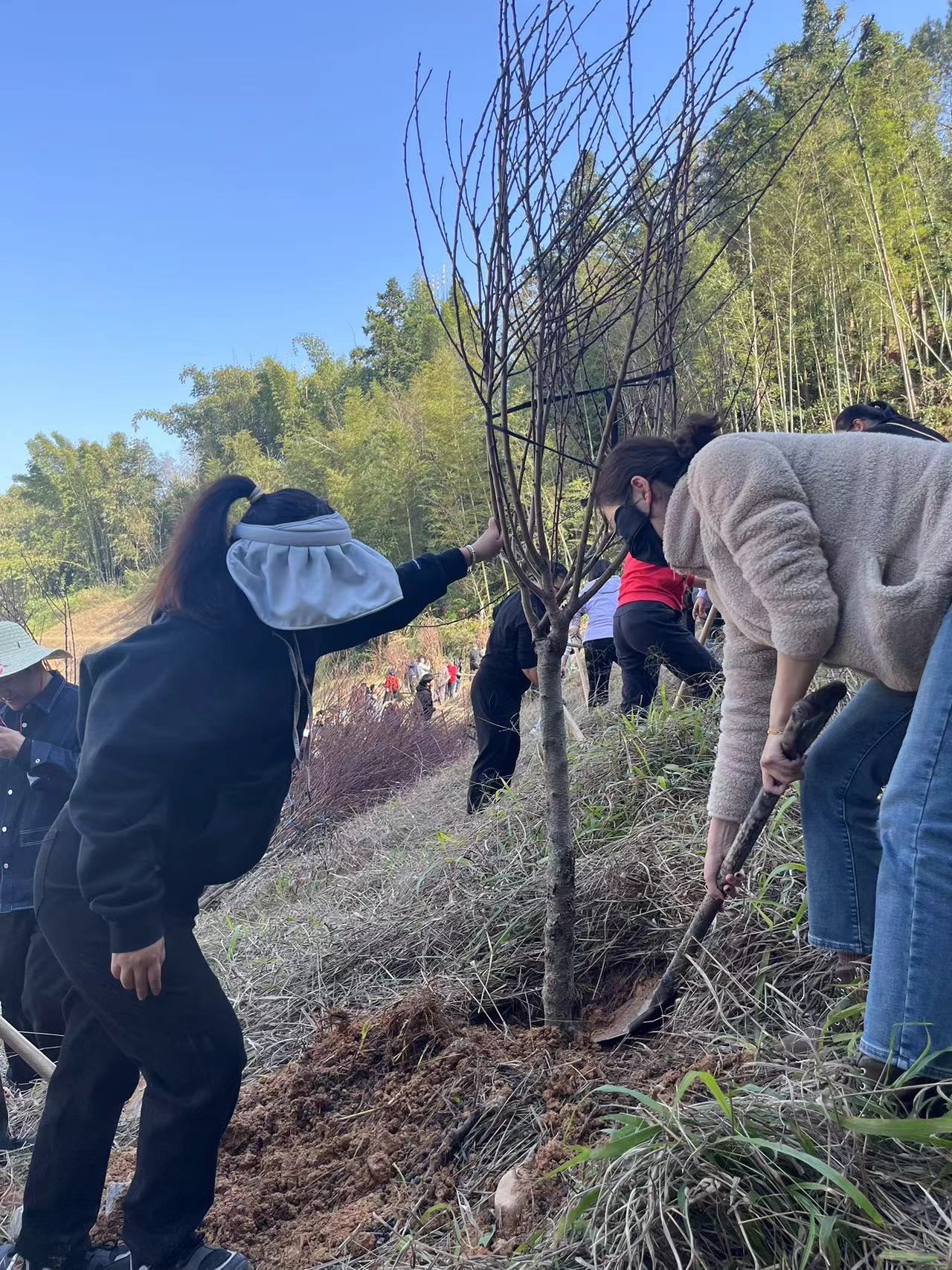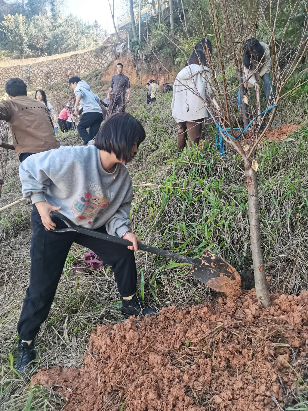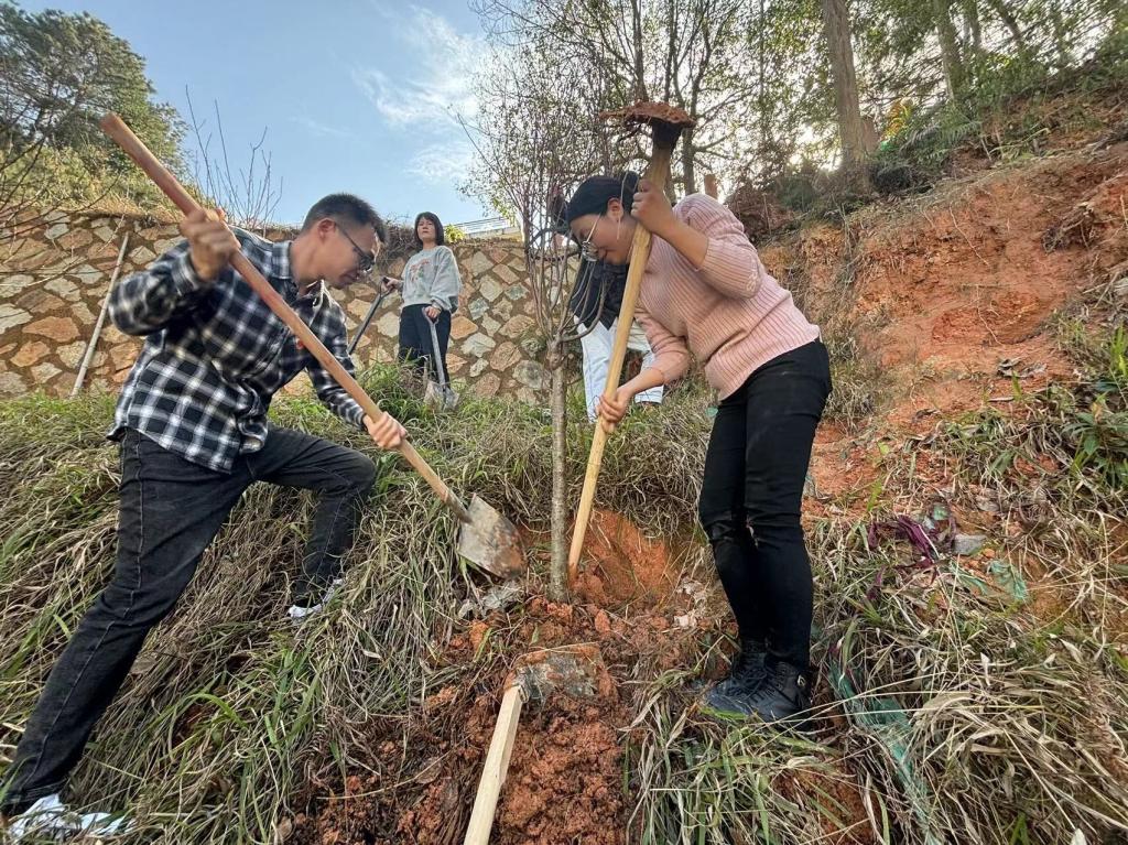 此次植树活动地点位于园林系后山一处陡坡之上,地形复杂,给植树工作带来了不小的挑战。然而,这并未阻挡园林系教工党支部成员们的热情与决心。他们手持锄头、铁锹等工具,迎着春风,踏上陡坡,在陡坡上,他们有的挖坑,有的培土,有的扶苗,有的浇水,每一个环节都一丝不苟,力求做到最好。经过几个小时的辛勤劳动,一棵棵新栽的树苗在陡坡上傲然挺立,为这片土地增添了新的生机与活力。看着自己的劳动成果,大家脸上都露出了满意的笑容。