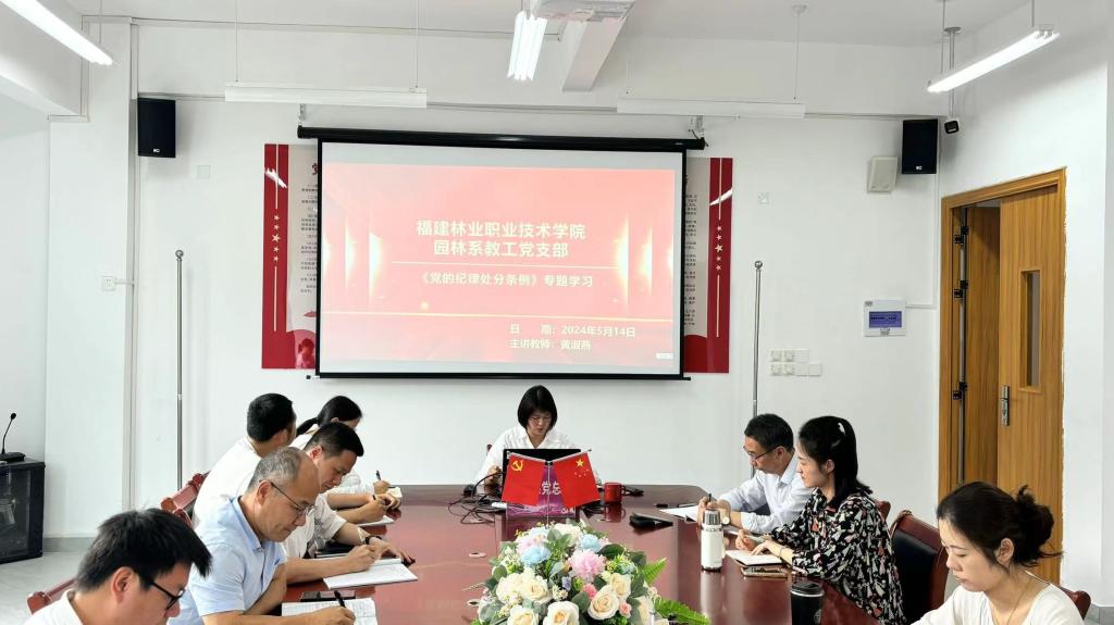 2024年5月14日,园林系教工党支部在园林系党建会议室开展“中国共产党纪律处分条例”专题党课。本次活动由园林系教工党支部书记黄淑燕担任主讲,旨在深入贯彻党的纪律建设要求,提高党员教师的纪律意识和规矩意识。教工支部党员及学生党员代表积极参加。