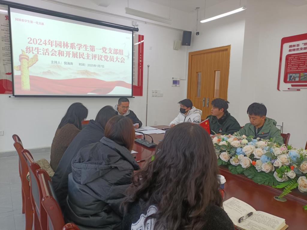 为深入学习贯彻习近平新时代中国特色社会主义思想,巩固深化党纪学习教育成果,发挥党的纪律教育约束、保障激励作用,为进一步全面深化改革、推进中国式现代化提供坚强纪律保证。2025年1月7日上午9点,园林系学生第一党支部于园林楼408园林系党建室开展2024年度组织生活会和开展民主评议党员大会,此次会议由园林系学生第一党支部书记倪海奔主持,支部全体党员参加。