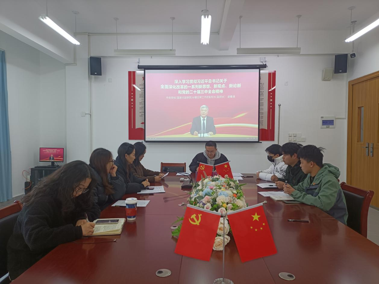 与会党员集体观看视频,共同学习《深入学习贯彻习近平总书记关于全面深化改革的一系列新思想、新观点、新论断和党的二十届三中全会精神》培训课程,观看后,支部师生党员、积极分子以互动分享、研讨交流等方式巩固学习成果。