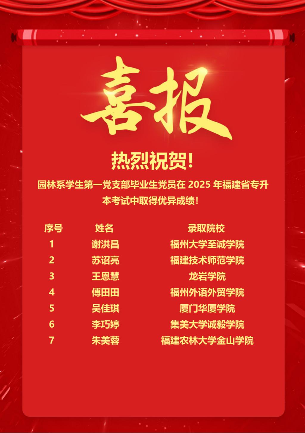 薪火相传,接力逐梦。在2025年福建省专升本考试中,园林系学生第一党支部7名毕业生党员以优异的成绩顺利被本科院校录取,在此向被录取的学子表示热烈的祝贺!