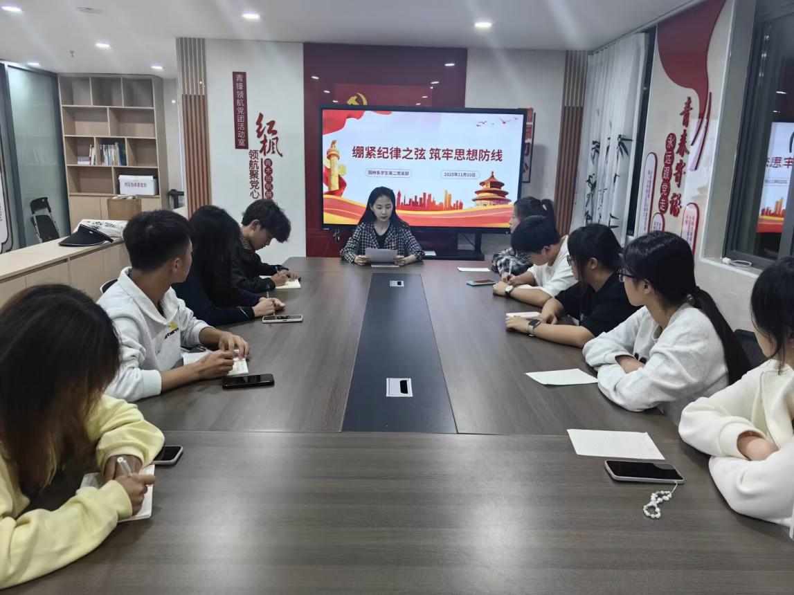 为深入学习贯彻习近平总书记关于党纪学习教育的重要讲话和重要指示精神,切实加强即将步入职场的学生党员纪律教育意识,引导学生党员把党纪学习作为人生“必修课”。2025年11月10日19时30分,园林系学生第二党支部于“一站式”学生社区开展“紧绷纪律之弦 筑牢思想防线”主题党日活动,由园林系学生第二党支部书记连静主持,支部党员参加本次活动。