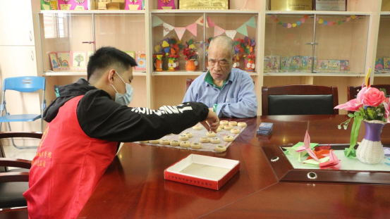 志愿者们热情洋溢地进入圣爱老人护理院,志愿者们的到来给老人们平淡的生活增添了一抹光彩,老人们热情地拉着志愿者们,与他们一起聊天。与此同时,一位喜爱象棋的老爷爷与志愿者架起了棋桌,开始了对弈。随后,志愿者也与其他老人开展一系列互动,如:打乒乓球、唱歌、跳舞等。欢声笑语充斥着整个圣爱老人护理院,青年大学生志愿者的到来不仅给老人们带来了心灵的慰籍,也使老人们感受到了园林系的温暖,传承了尊老、爱老的中华传统美德,使整个院内洋溢着温馨、祥和的气氛。时间易逝,与老人们在一起的时间更是如此,志愿者们依依不舍的跟老人们告别。老人们希望志愿者们以后常来,志愿者们纷纷点头应许了下次的赴约。