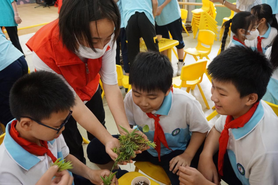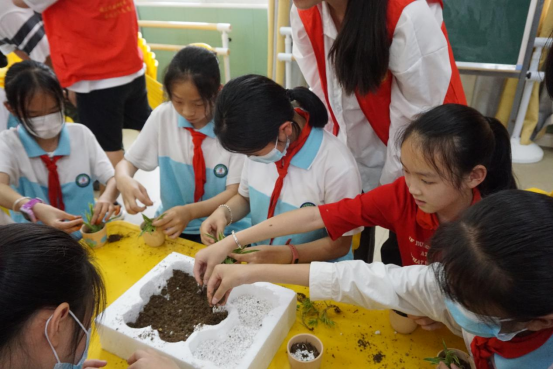 科普结束后园林系与信息工程系的志愿者们将所需要的的花苗与工具准备好,由园林系专业老师、花卉协会负责人引导小朋友们进行了植物种植实践。老师在讲台前介绍了本次实践花苗的生长习性,如吊兰、海棠花等以及花苗所需土壤的配比与制作过程,之后讲解了如何在花盆里进行种植。