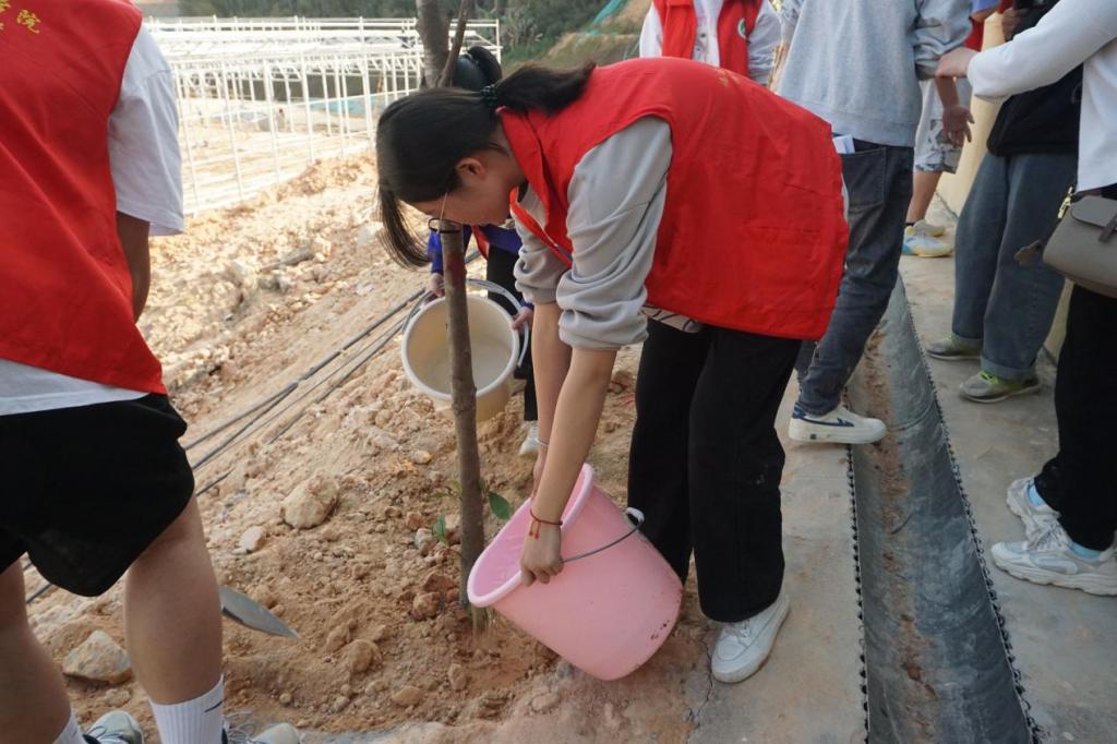 下午3时,小红花志愿服务队来到林职院江南校区后山大棚。志愿者们铲土填坑、挥锹培土、夯实土层、浇水灌根,来回穿梭,分工合作。看着自己的劳动成果—颗颗树挺拔而立时,露出了心满意足笑容。