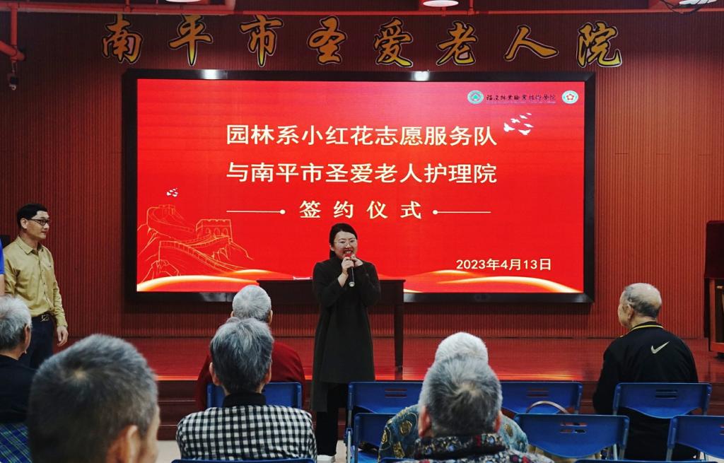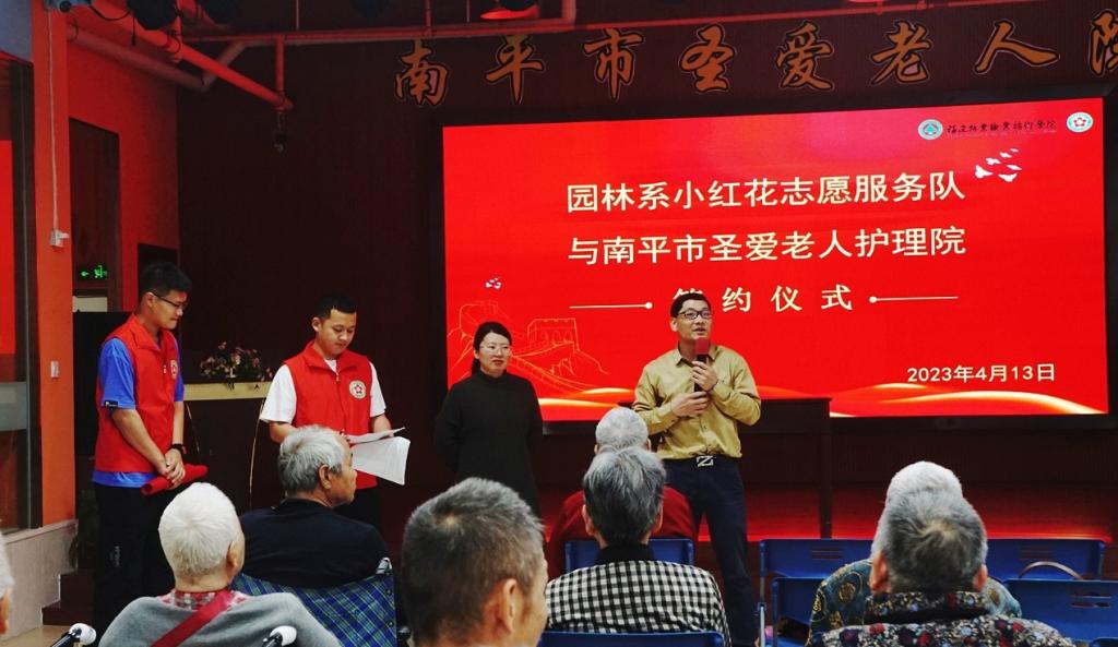 4月13日下午,福建林业职业技术学院园林系小红花志愿服务队与圣爱老人护理院举行志愿服务共建签约仪式。圣爱护理院院长严建忠、行政部主任陈联邦以及园林系学生科科长兼团总支书记吴锦鸿出席本次活动。