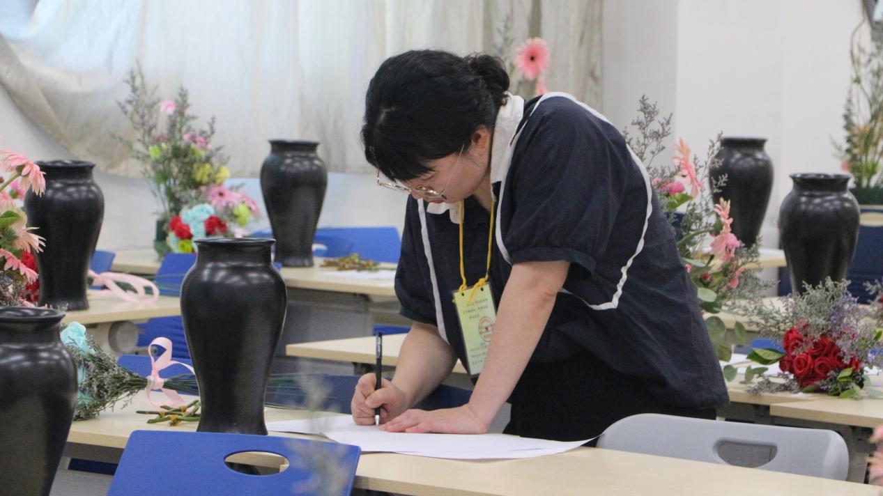 本次水平鉴定考试包括瓶口三个“撒”的制作,L形钵花的插制,四面观半球形花束的插制。选手们需要在一个半小时内完成花材挑选、花枝裁剪、位置固定等系列环节的操作。同时,考生需要按照设计要求,将一朵或多朵鲜花造型成各种形状和大小并进行装饰,充分考查考生对各类花艺艺术造型手法的掌握情况和程度。