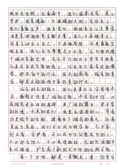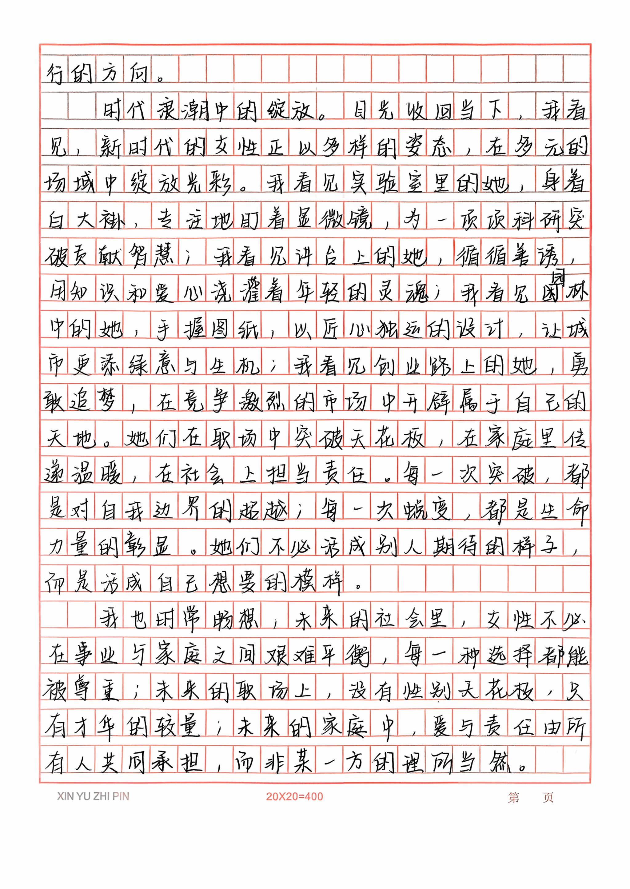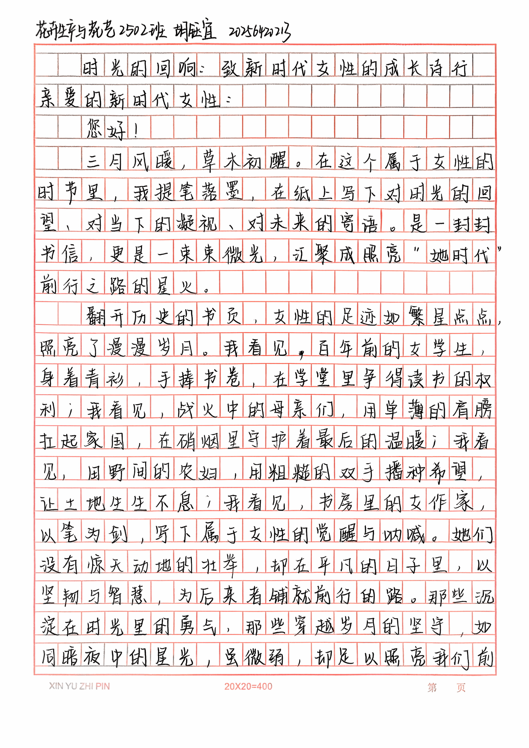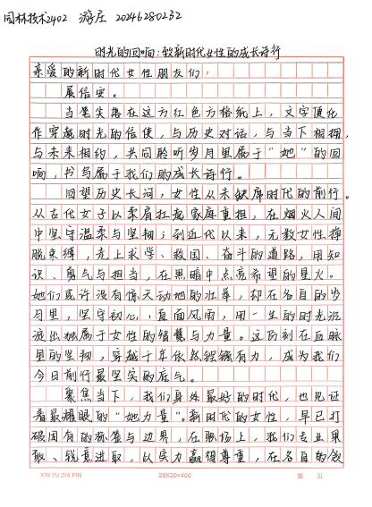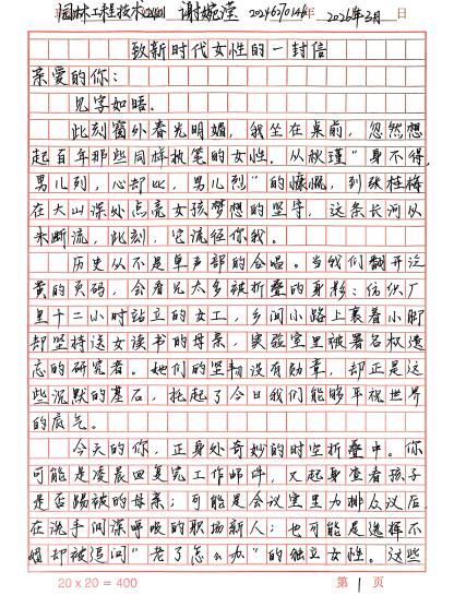 活动中,同学们以红色方格纸为载体,以笔墨传心意,将对新时代女性的敬意与感悟凝于笔端。大家回望历史,致敬秋瑾、张桂梅等先辈的坚守与奉献,追忆不同时代女性的坚韧足迹;聚焦当下,捕捉身边女性在校园、职场的闪光瞬间,展现“她力量”的多元风采;展望未来,寄语女性自由平等、逐梦前行,每一封书信都承载着真挚情感与美好期许。参赛作品内容积极向上、思想深刻,既彰显了园林系学子的人文情怀与写作功底,也传递出尊重女性、赞美女性的真挚情感,活动以书信为媒介,让同学们在书写中感悟女性力量,在传承中弘扬时代精神,进一步丰富了校园文化内涵,营造了温暖向上、尊重包容的育人氛围。