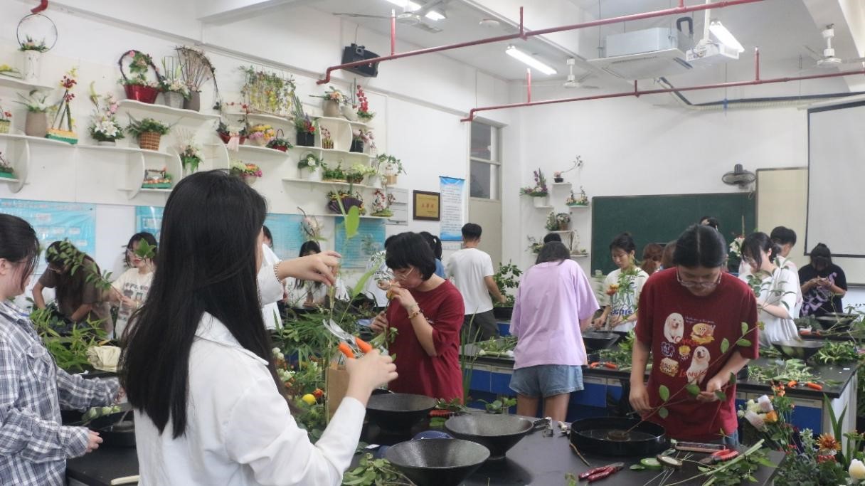 为庆祝建校70周年,为加强学风建设,提高学生实践动手能力,形成注重专业技能的学习氛围,更好地弘扬精益求精的工匠精神,园林系于2023年6月19日下午午2点30分,园林系技能活动月“花艺”赛项于林学楼711花艺设计制作实训室正式拉开帷幕。本次赛项由黄淑燕老师负责统筹安排,甘露老师负责赛前准备及赛后考场恢复。赛项评委老师有黄淑燕、甘露及张称称老师,园林系具有插花花艺基础的学生参与此次竞赛。