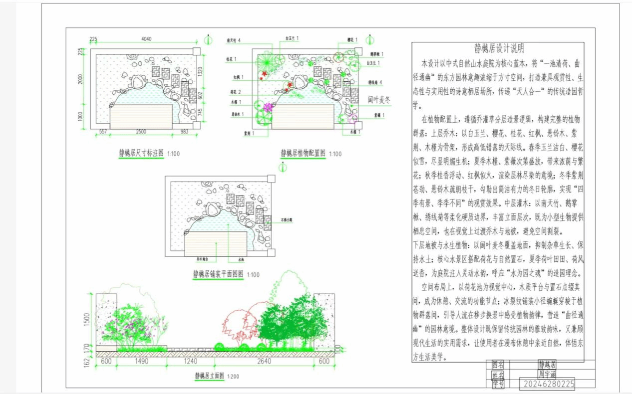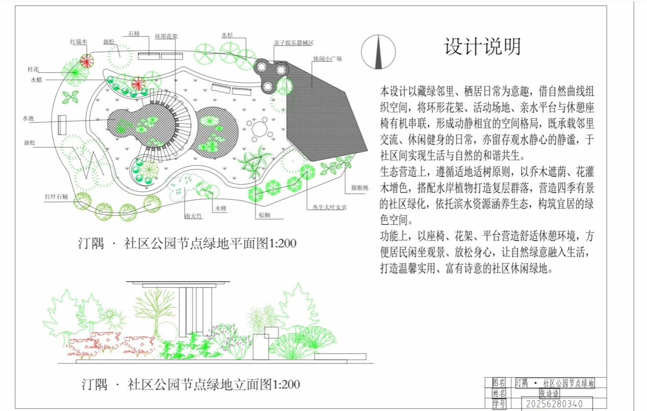 本次比赛以线上个人参赛形式开展。比赛要求选手使用CAD软件,在主办方提供的A2框架内完成整体平面施工图创作,需同步呈现局部立面效果图,并包含指南针图例、比例尺标注、植物图例等规范内容,完成后附上设计说明。赛事严格把控原创性,严禁抄袭与代作,保障公平公正。